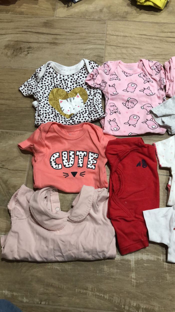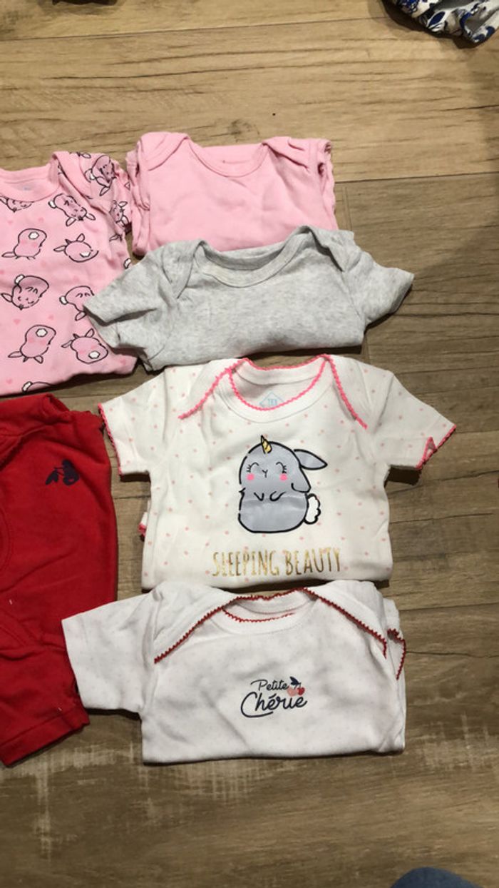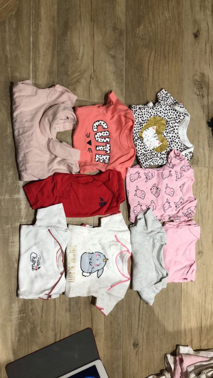 pour la plupart marque tex un H&M et deux autres autres marque le gris a une légère tache en haut du col voir photo les autres ont soit été porté une fois soit jamais juste lavé taille 12 mois et le H&M qui est rose avec un col claudine est un 74 cm