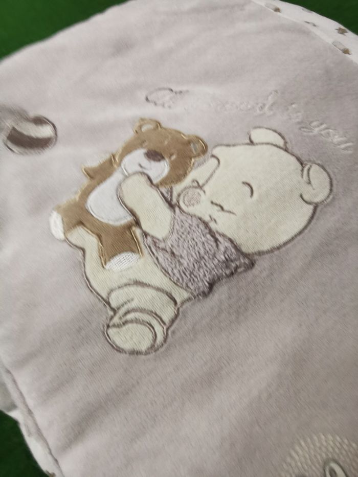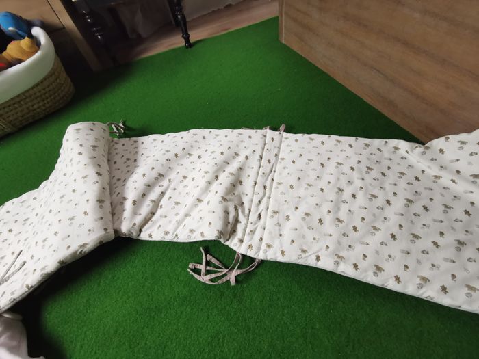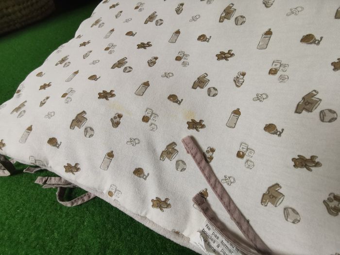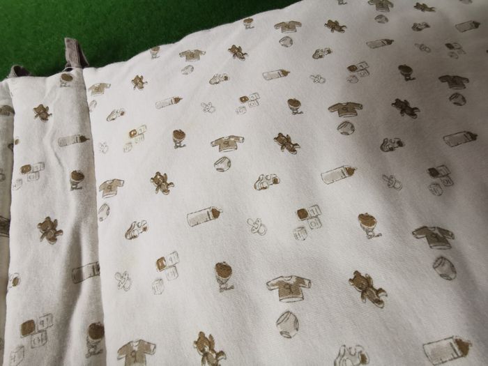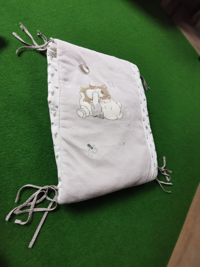 Tour du lit bébé Disney Baby Pooh, en tissu doux pilou pilou extérieur couleur gris beige et l'intérieur est en tissu doux du coton blanc imprimé jouets, dont un côté est un peu taché, l'extérieur est un peu marqué par endroir, dans l'ensemble, en très bon état général et neutre, convient aux filles comme aux garçons. Dimensions : Hauteur : 38,5 cm Longueur : 182 cm Poids : 550g Pensez à faire des lots afin de bénéficier des remises que j'ai régulièrement sur ma page.