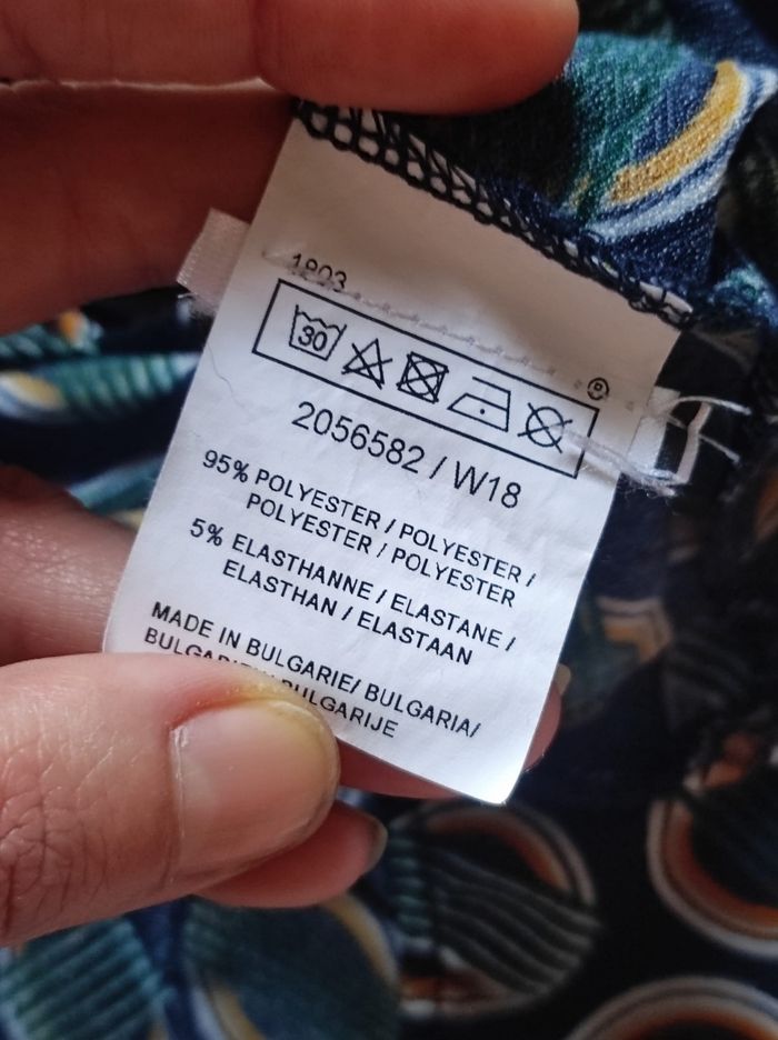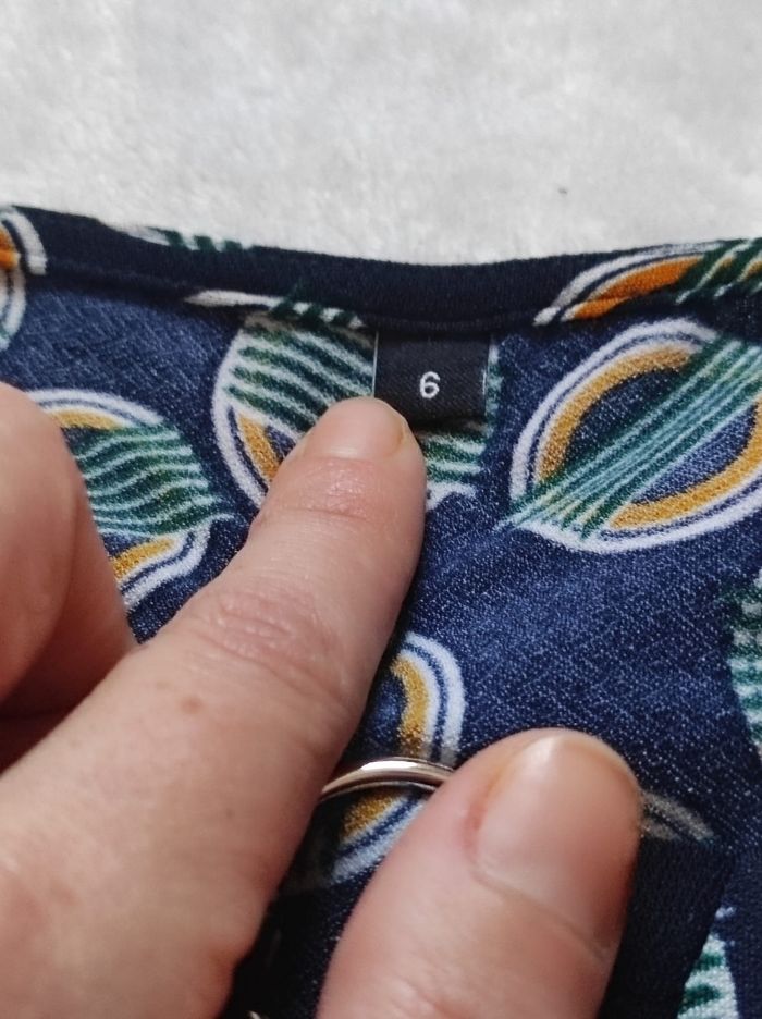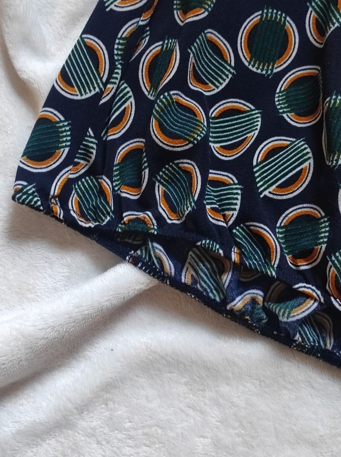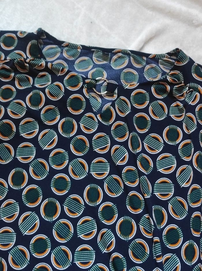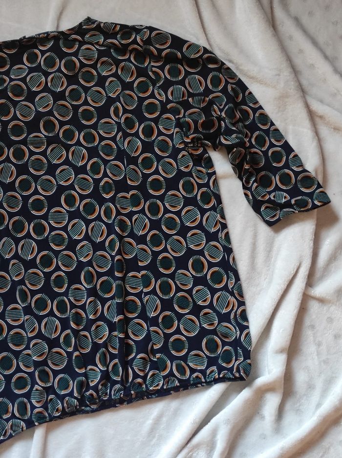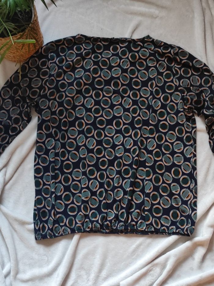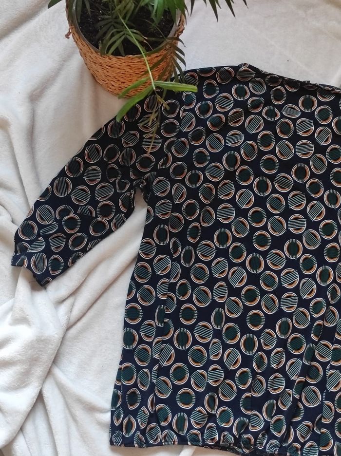 blouse mi saison afficher étiquette 6 , taille unique. Manches 3/4 quart, matière légère et fluide ( 95% polyester et 5% elasthanne), motifs cercle sur fond bleu marine. Élastique à la taille. Dimensions Épaules 45,5 cm Aisselles 67 cm Hauteur 68,5 cm Tour de taille 52 cm En parfait état