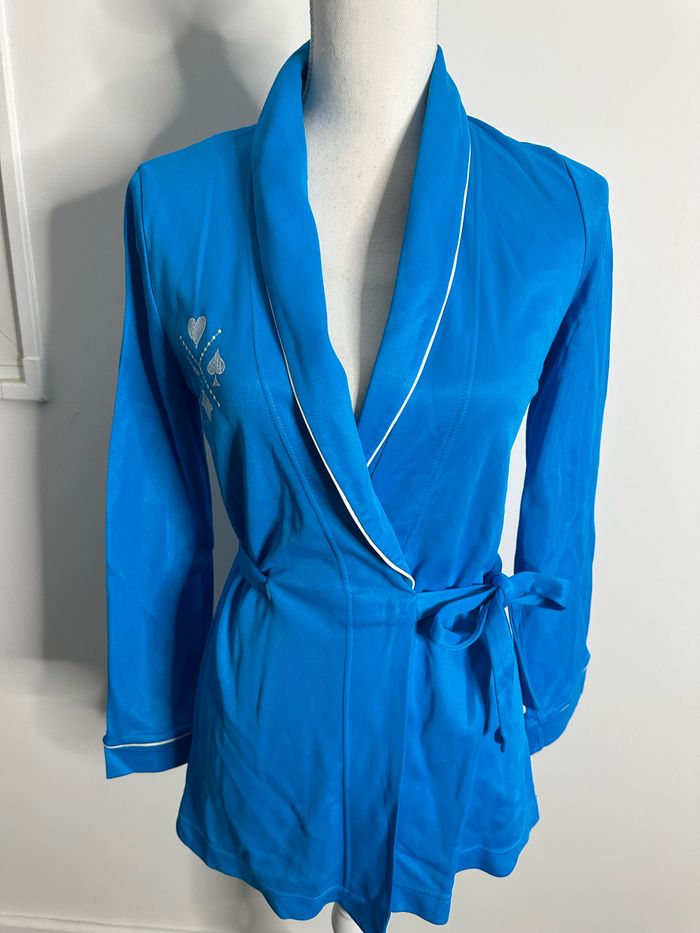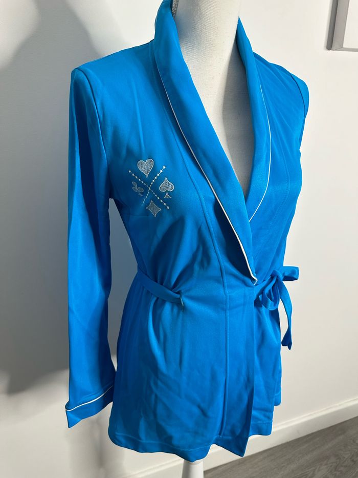 Peignoir kimono - Excellent état - Taille unique, ok du 36 au 42 Dimensions en bas de l’annonce - Couleur bleue - Broderies blanches cœur trèfle pique carreau - Se ferme avec une ceinture - Polyamide et Acétate - Fabrication française 🇫🇷 - Tissus satiné - Liseré blanc - Vintage, années 80’ - Lingelor Dimensions: - 48cm niveau aisselles - 68cm de long
