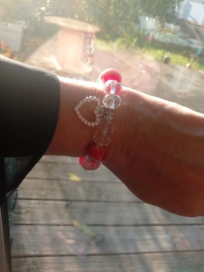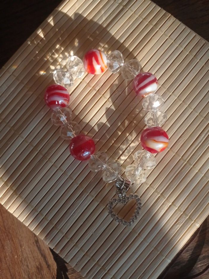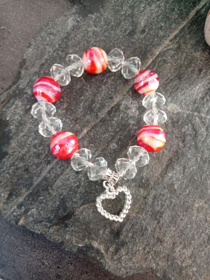 Ce bracelet a été réalisé par mes soins 💕 Grosses perles rouges, rouge et blanche, autres perles transparentes...sur élastique. Petit coeur en acier inoxydable couleur argent et qui brille 😉 Modèle unique Taille poignet 18 cm.