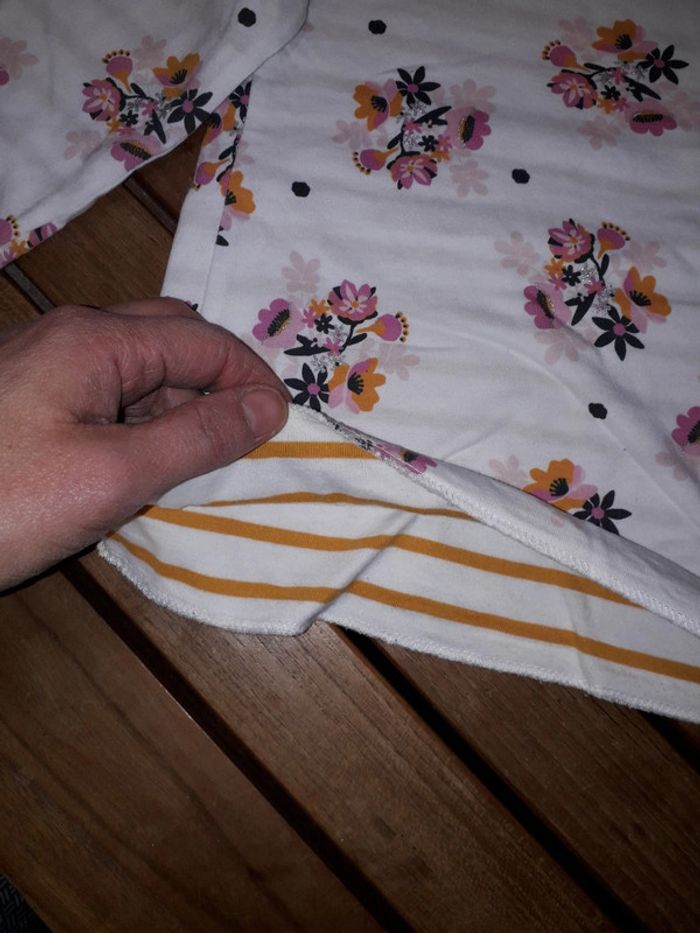 Porté 1 ou 2 fois Etat neuf sans étiquette Un côté rayé jaune moutarde / beige et l'autre beige avec fleurs Epais car 2 couches de tee shirt tient chaud