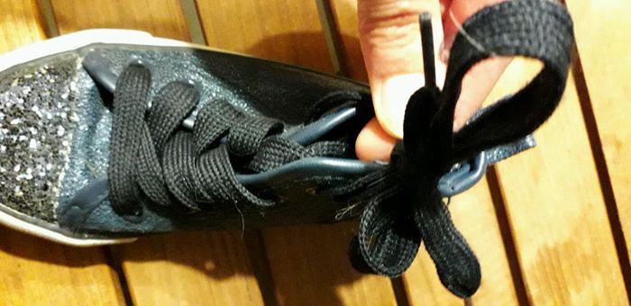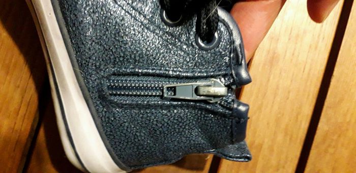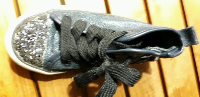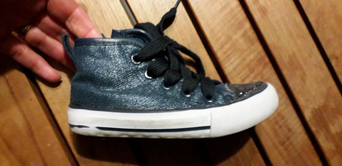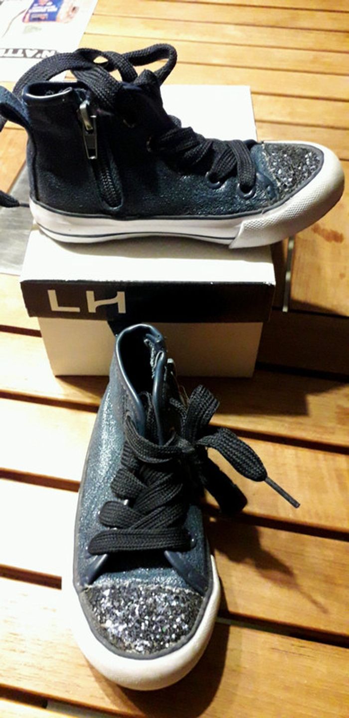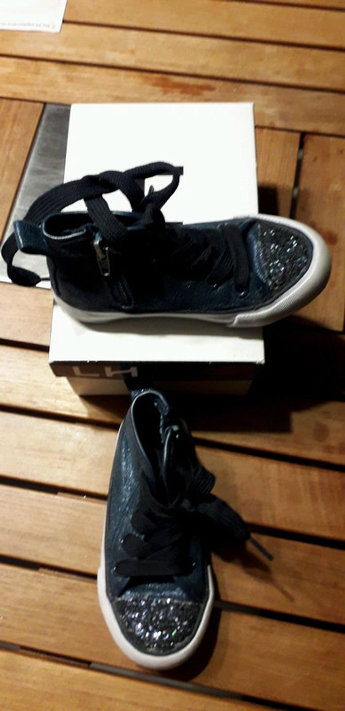 Tennis montan5es bleues nuit type converse Fermeture sur le côté avec système scratch pour pas redescendre. Portées quzlques fois mais en très bon état Brillant sur le devant les petites filles adorent Taille correctement
