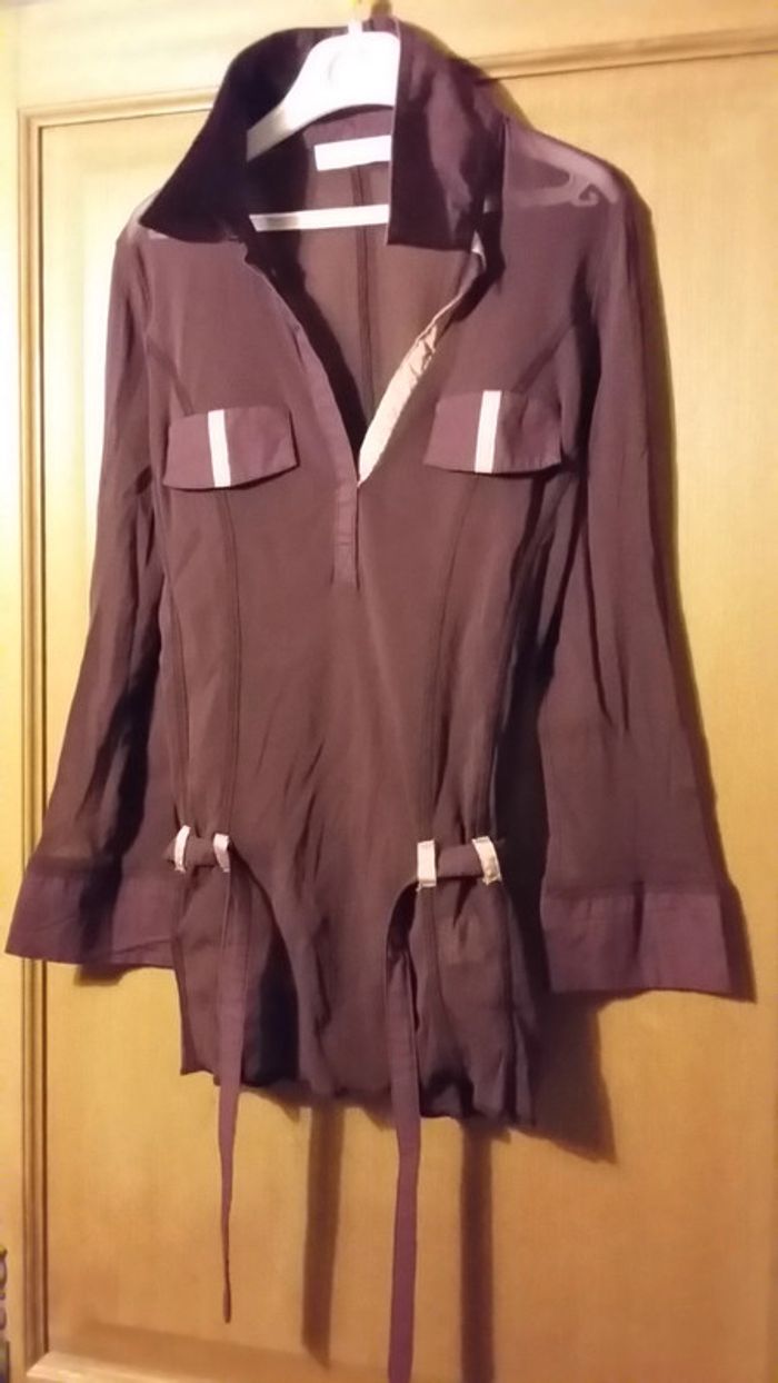 Type mousseline un peu transparent à porter avec une jolie lingerie et/ou un débardeur fin Très joli porté avec sa ceinture Couleur prune avec une touche de rose Porté quelque fois mais en très bon état
