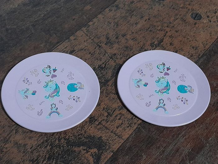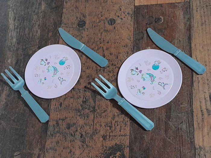 Assiettes décor "Licorne". Accessoires pour dînette bon état. Vendus comme sur les photos. Consultez mes autres annonces, création de lot possible sur simple demande .🙂