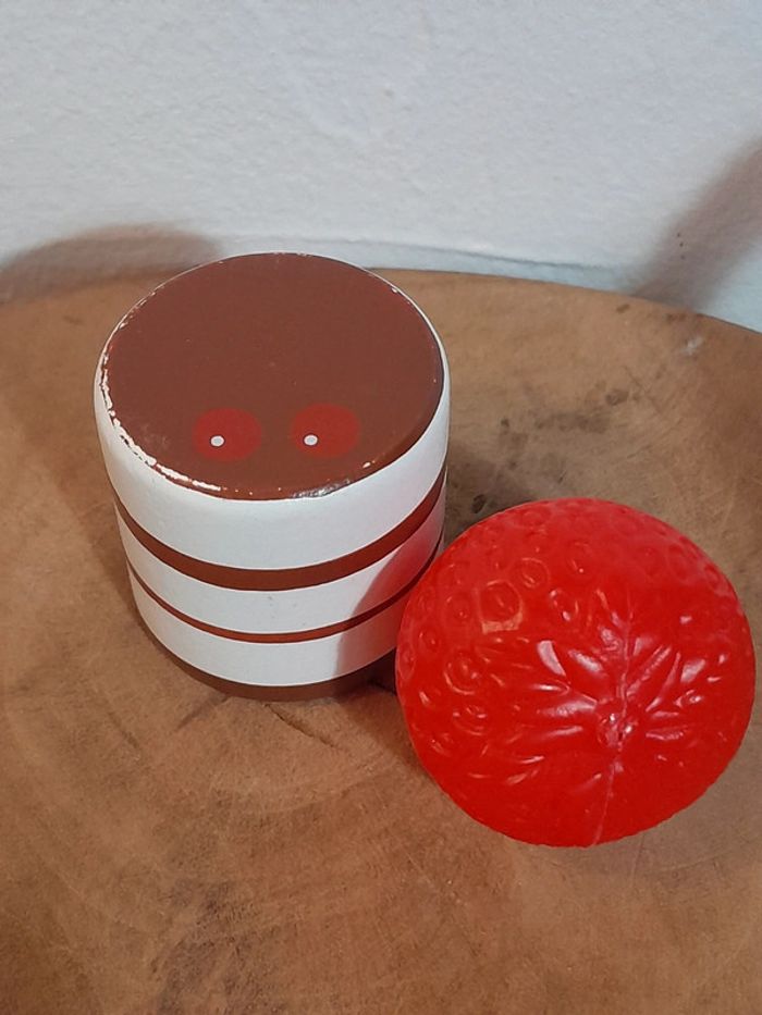 Gâteau en bois et fraise en plastique. Accessoires pour dînette bon état. Vendus comme sur les photos. Consultez mes autres annonces, création de lot possible sur simple demande .🙂