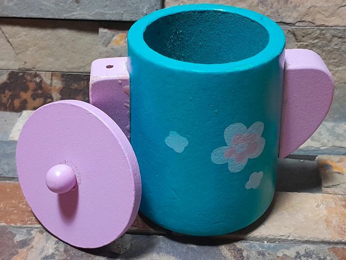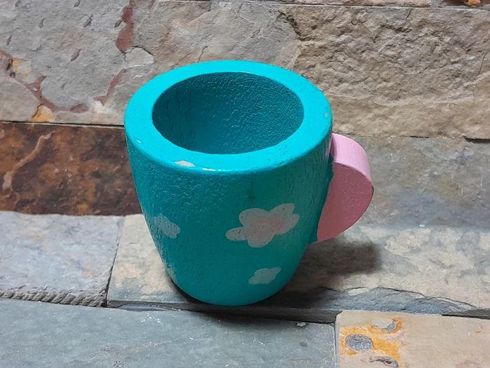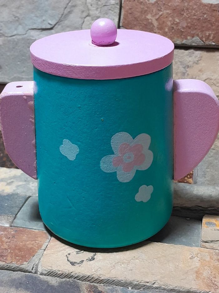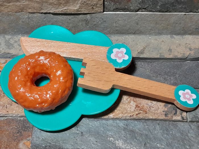 Ensemble en bois sauf l'assiette et donut's. Verre offert car peinture écaillée dessous.