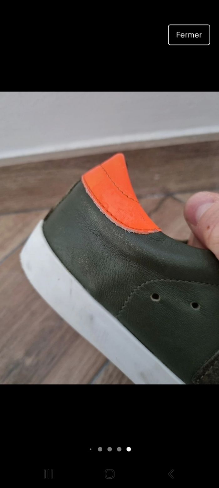 Baskets enfant garçon taille 31. Sur la dernière photo petite égratignure mais très peu visible. Portées quelques fois mais en bon état. Couleur kaki et orange fluo.