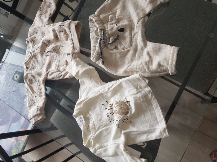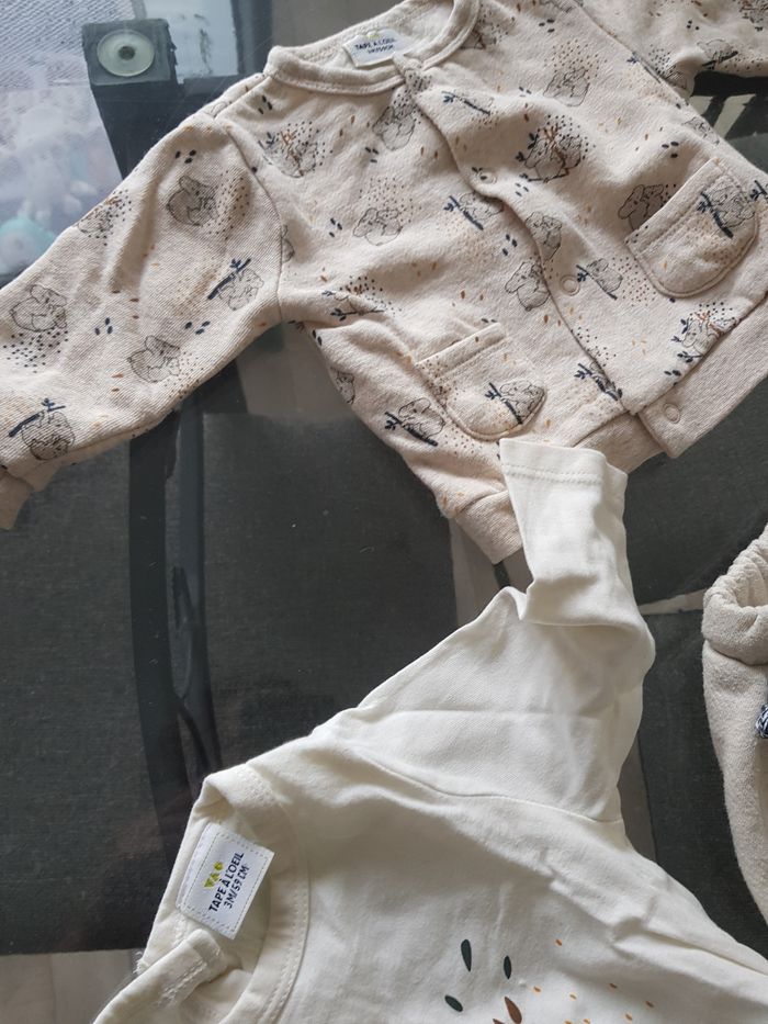 Tenue 3 mois Porté que 1 fois car bebe a grandit trop vite En parfait état Les produits peuvent être vendus séparément si besoin Je les met ensemble car c'est mieux d'avoir l'ensemble