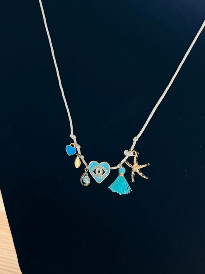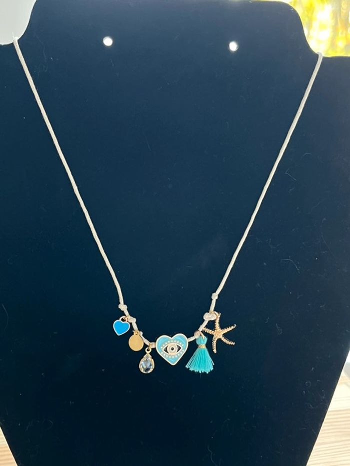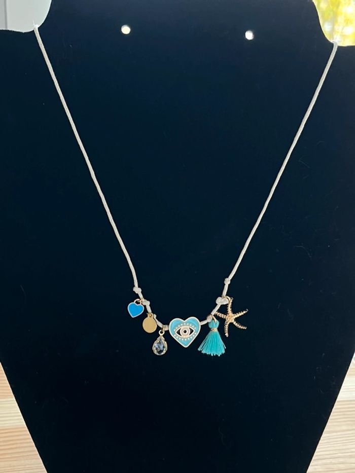 Collier cordon pendentifs grigris breloques doré et bleu - photo numéro 4