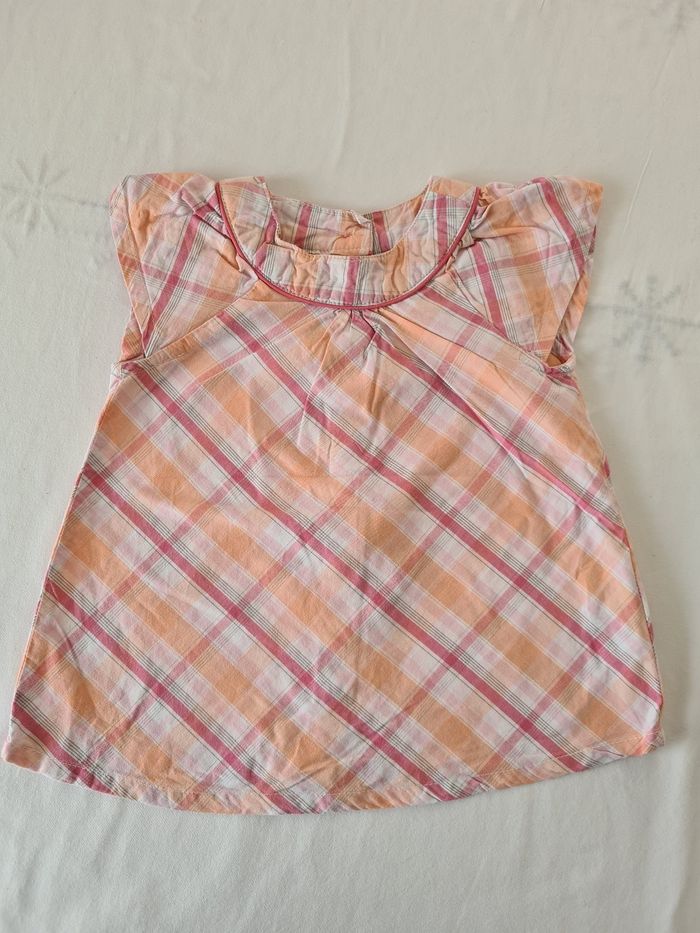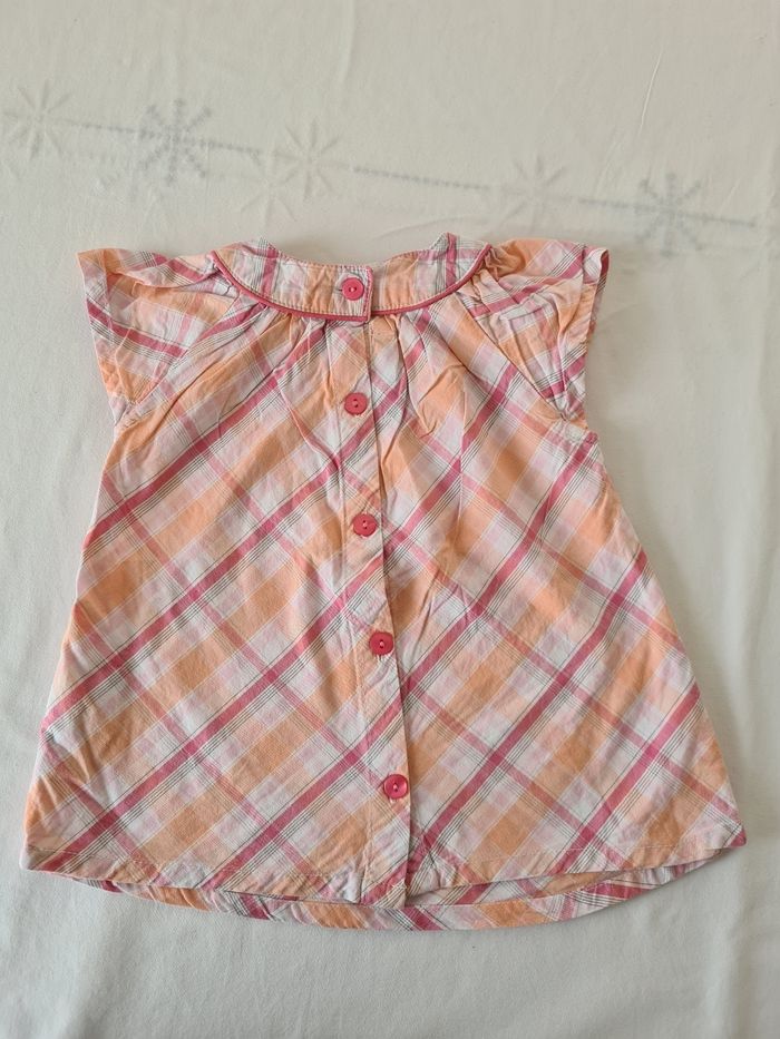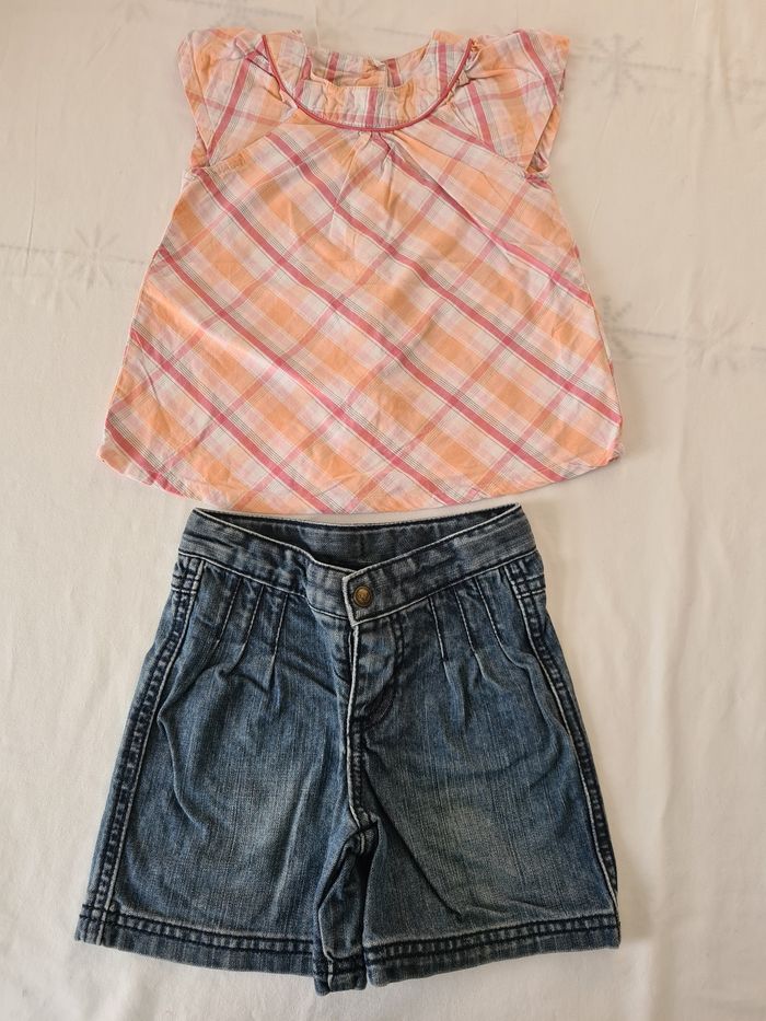 Ensemble 9 mois composé : - d'un haut à manches courtes tape à l'œil avec ouverture intégrale au dos - d'un short/jupe vertbaudet avec ouverture par boutons pressions et taille ajustable à la taille.