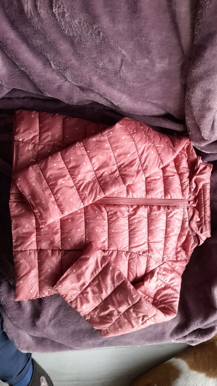 Veste matelassée rose, à pois blancs , avec capuche cachée dans le col arrière