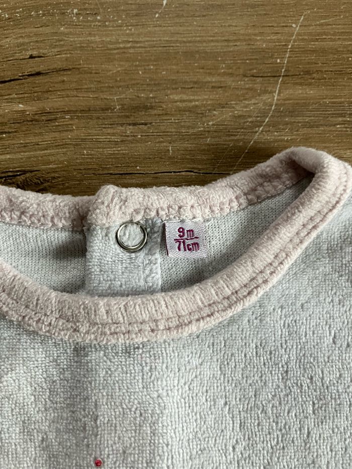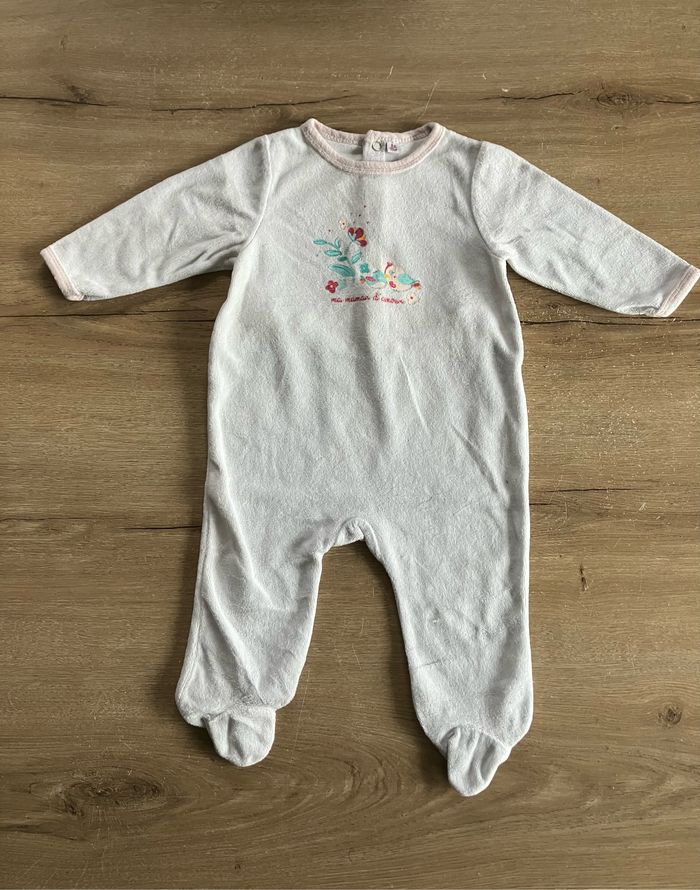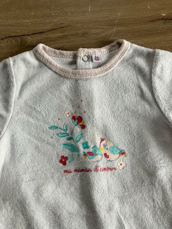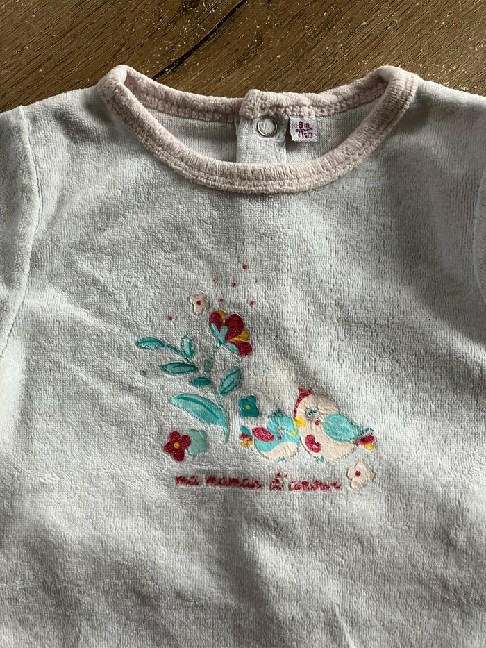 Pyjama grenouillère en velours Pommette taille 9 mois Bon état (légère tâche au-dessus des 2 oiseaux, voir dernière photo)