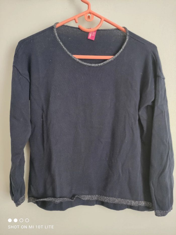 Pull en bon état couleur bleu marine plus foncé que sur la photo bordures argent taille 12 ans