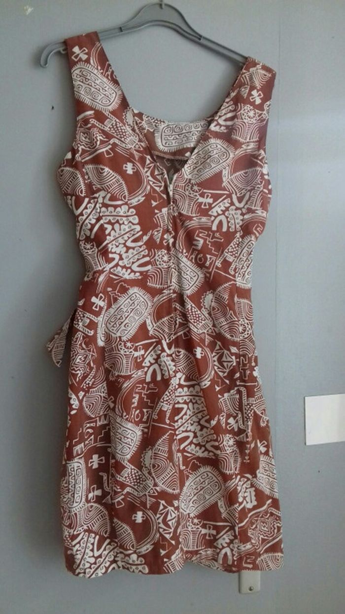 Robe marron et blanc largeur d'une aisselle à l'autre 45 cm largeur de la taille à plat 43 cm environ . 64 % viscose 36% polyester etiquetée taille 42 Longueur environ 83 cm Fermeture éclair au dos Bénéfice de mes ventes pour les chats que j'ai sorti de la rue N'hésitez pas à regarder mes autres articles réduction sur les lots
