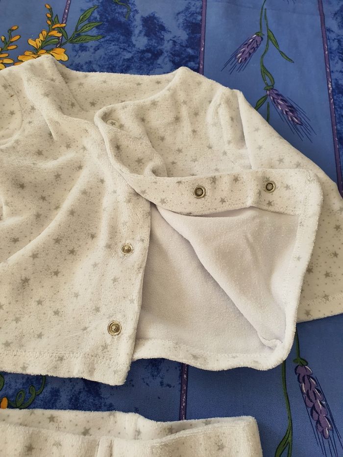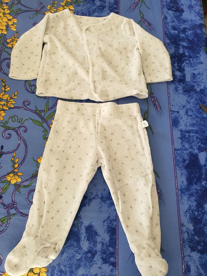 Ensemble chaud comprenant 1 veste se fermant à l'avant par pressions 1 pantalon taille élastique Taille 3-6 mois Très bon état