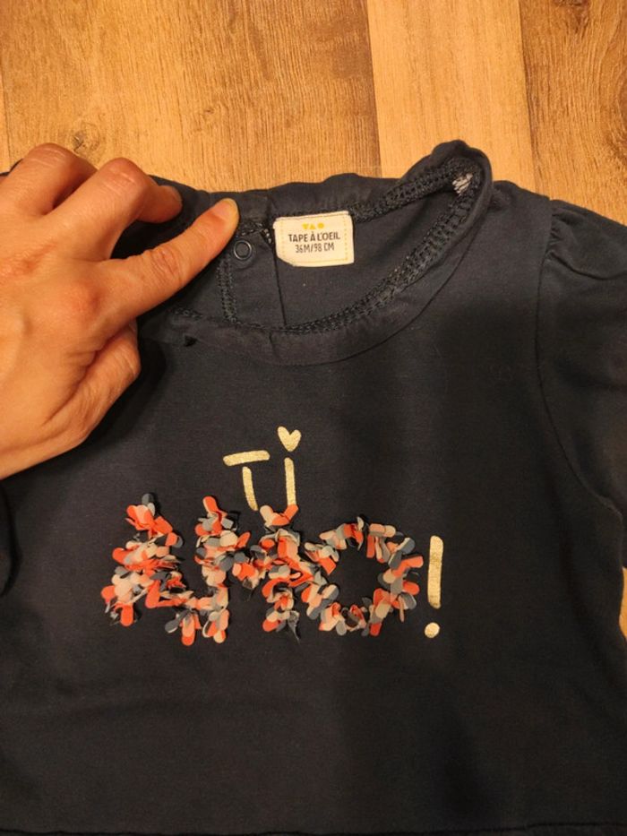 Tee-shirt longue manches Tape à l'oeil en très bon état 36 mois mais taille véritablement 24 mois ! #23moismarygio59babygirl #24moismarygio59babygirl