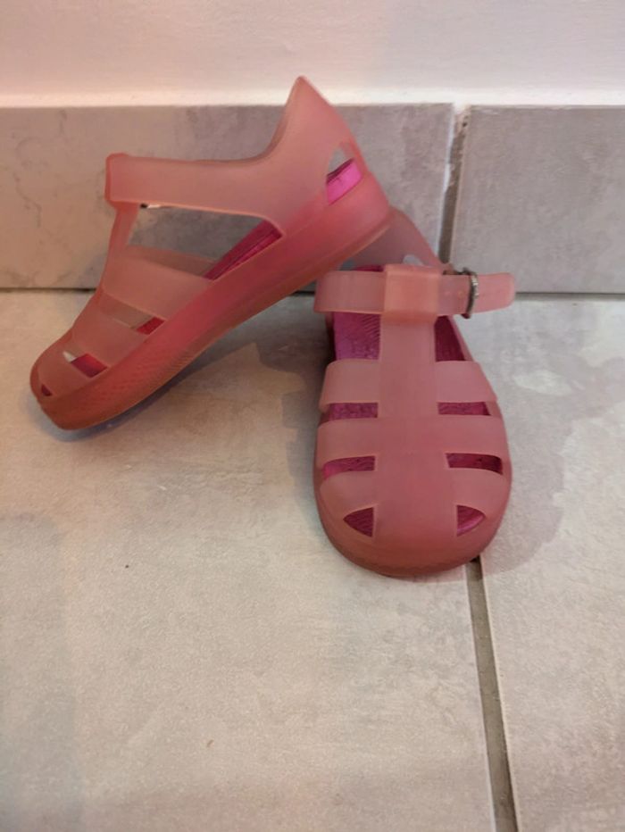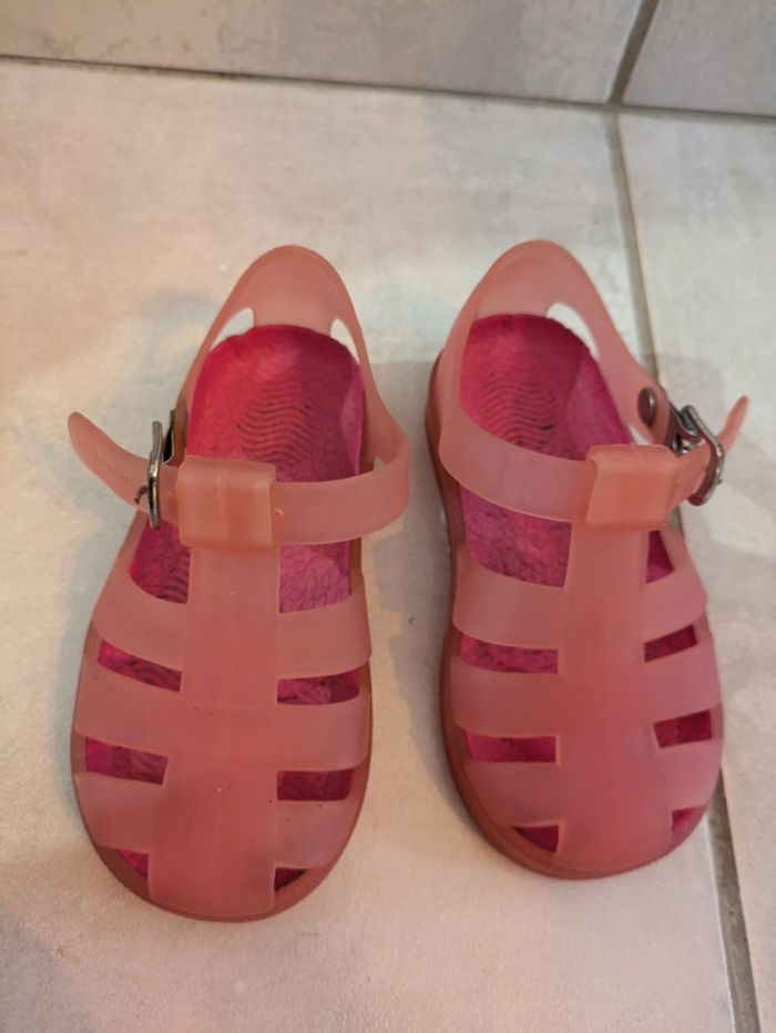 Méduses rose avec semelle , orchestra. Lanière a l'arrière pour meilleur maintien. . La semelle peut s'enlever si l'enfant va dans l'eau avec.