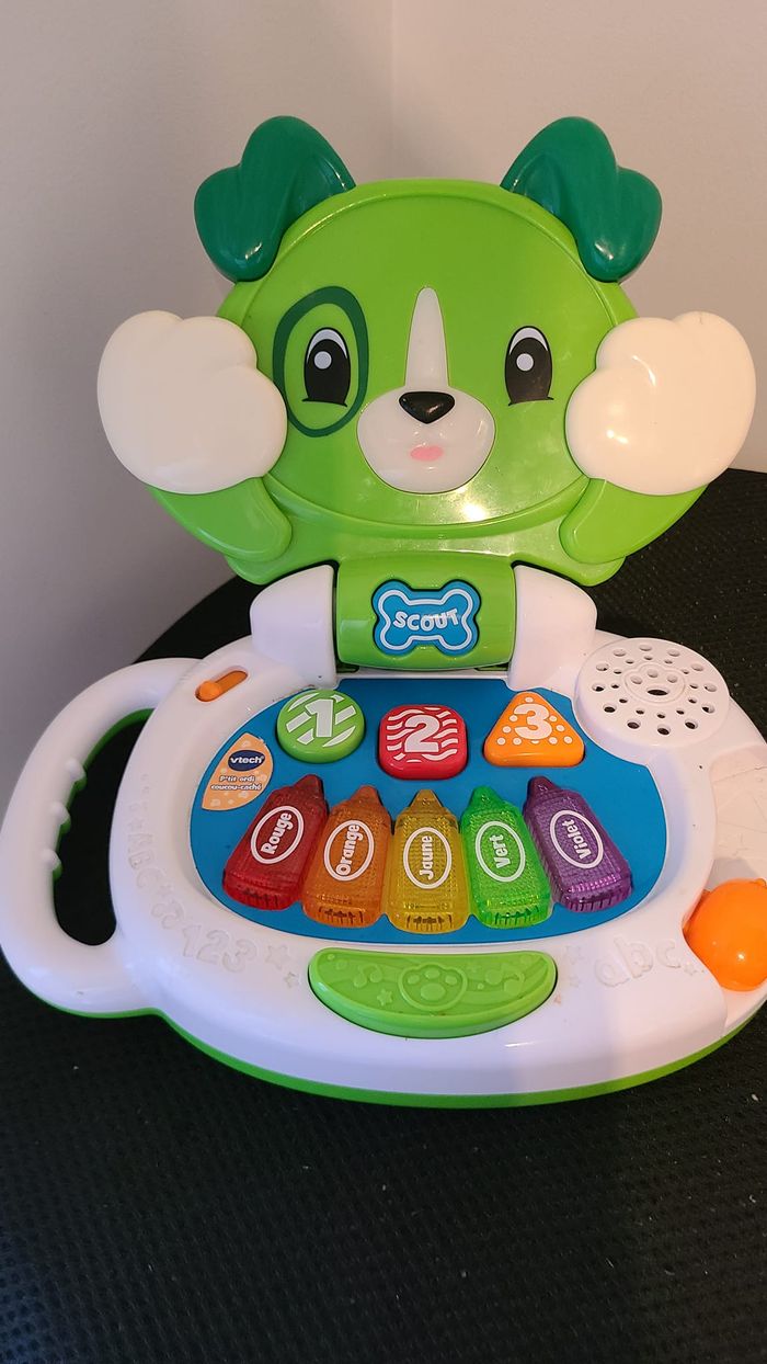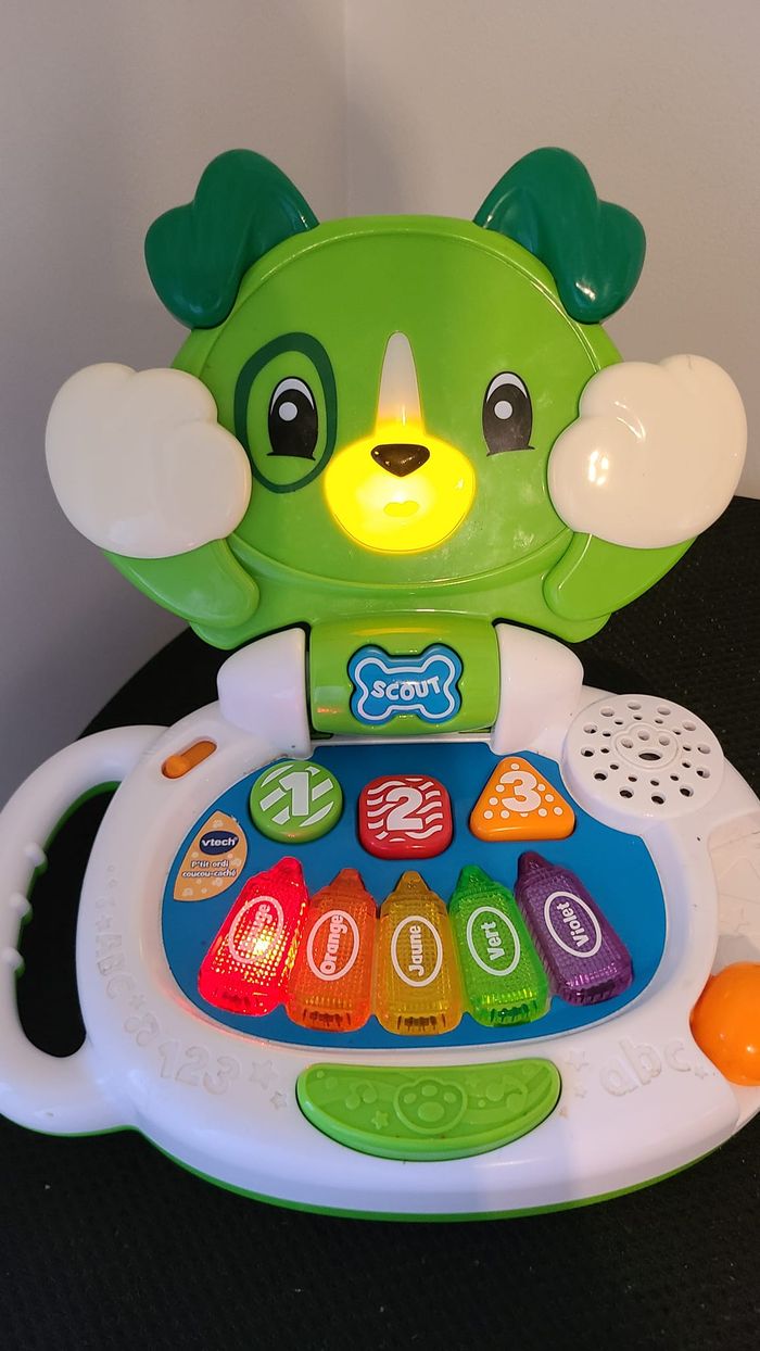 Un P’tit ordi rigolo pour imiter les plus grands !Le P’tit ordi coucou-caché accompagne Bébé dans ses premières découvertes !Comme un vrai p’tit ordi, Bébé peut l’ouvrir pour jouer et le fermer pour l’emmener partout avec lui !Un ordi adapté aux tout-petits pour apprendre les couleurs, les premiers chiffres, les formes et les contraires :Coucou-caché : appuyer sur le bouton Os pour jouer à coucou-caché avec Scout. Le museau du petit chien s’illumine quand il parle !Formes et chiffres: appuyer sur chacun des trois boutons..