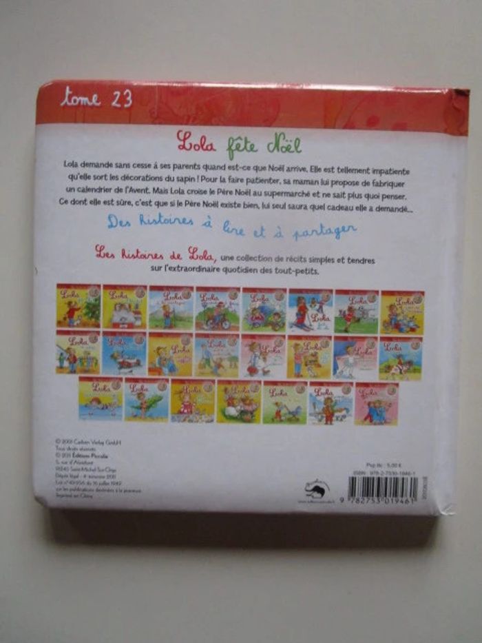 Lola demande sans cesse à ses parents quand est-ce que Noël arrive. Elle est tellement impatiente qu'elle sort les décorations du sapin ! Pour la faire patienter, sa maman lui propose de fabriquer un calendrier de l'Avent. Mais Lola croise le Père Noël au supermarché et ne sait plus quoi penser. Ce dont elle est sûre, c'est que si le Père Noël existe bien, lui seul saura quel cadeau elle a demandé... Éditeur ‏ : ‎ Piccolia 22 pages Âge de lecture ‏ : ‎ 3 - 6 ans Dimensions ‏ : ‎ 20 x 1 x 20 cm Livre en bon état (Légères traces de manipulation) Je vends d'autres livres sur noel #phil_peg_noel #lola #noel