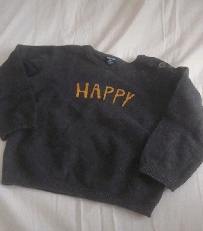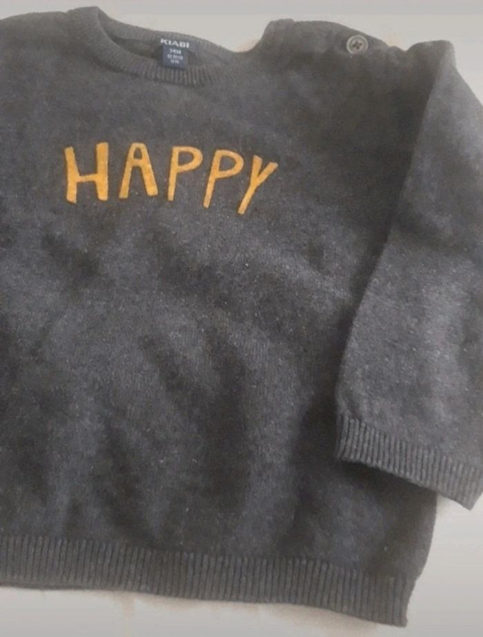 Vends pull Gris foncé Happy écrit en jaune dessus Kiabi 24 mois #juhjuh24mois #juhjuh23mois
