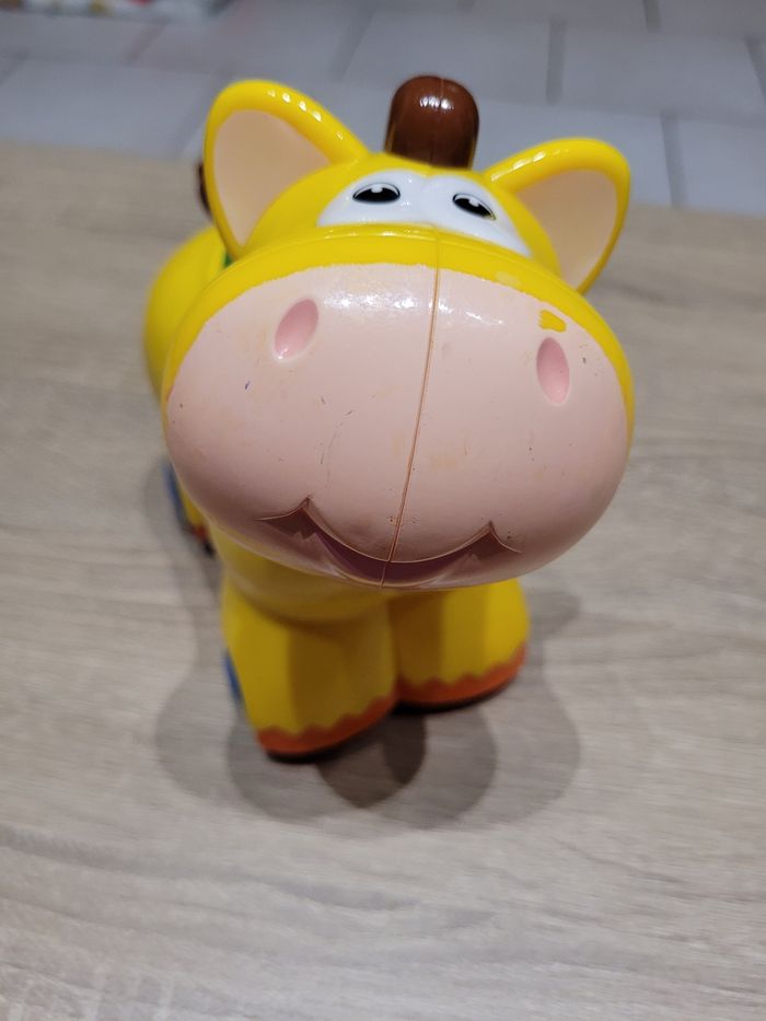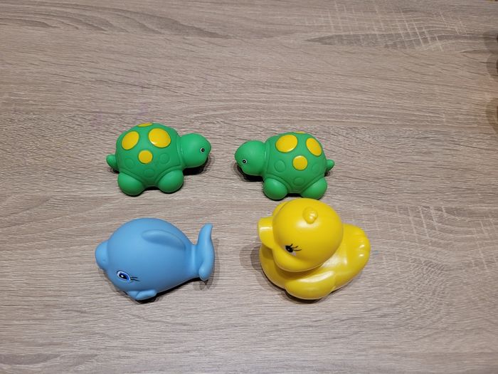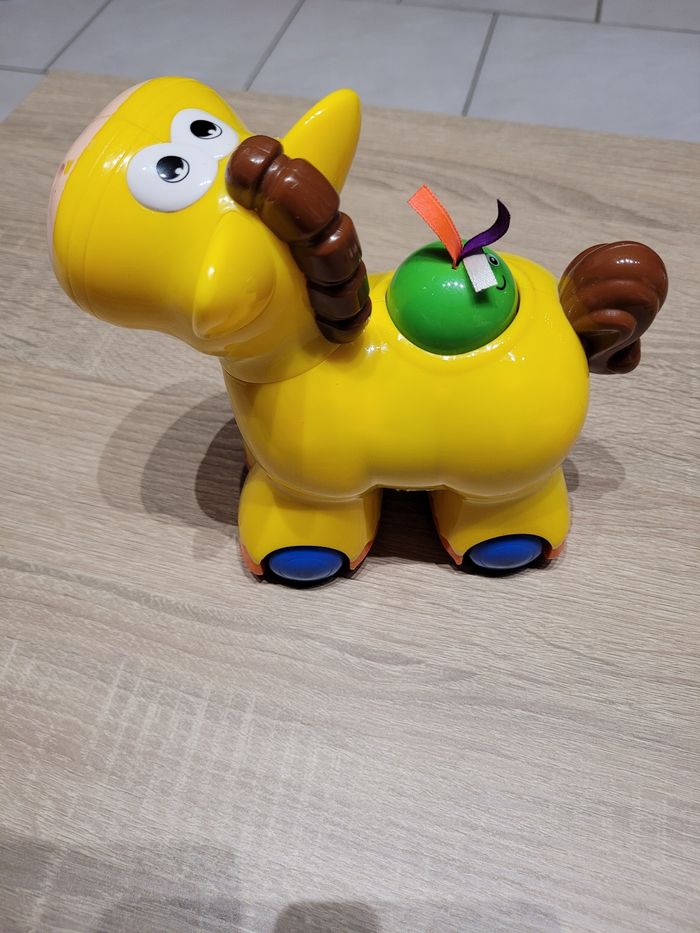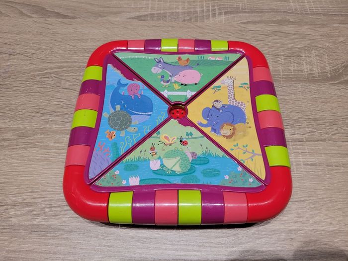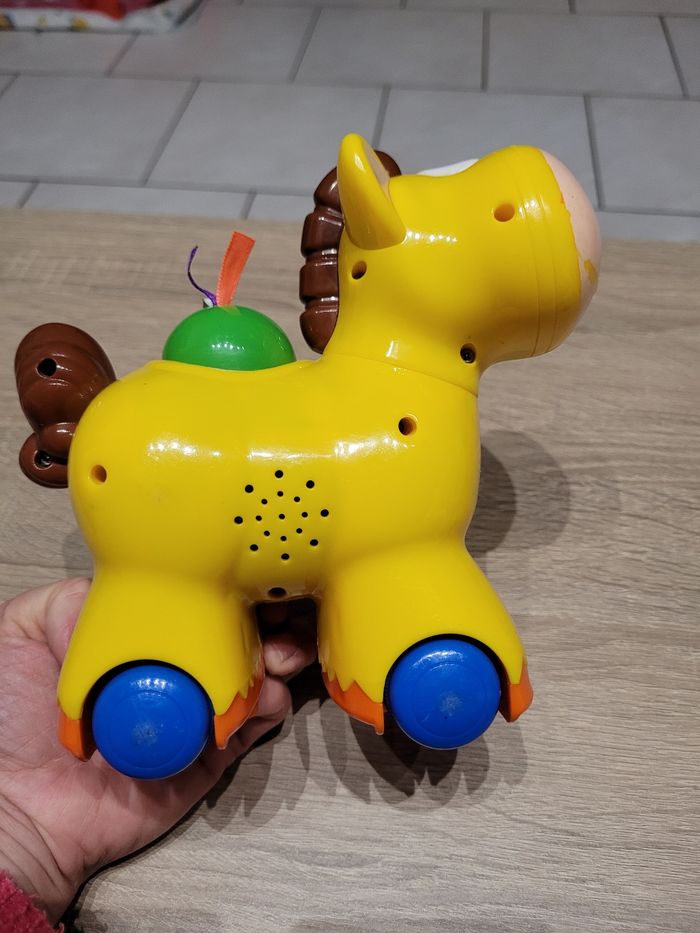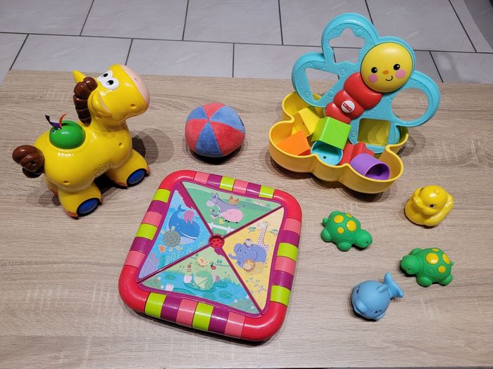 Vend lot de jeux d'éveil en très bon état et bon état juste des signes d'usures liés au jeu (voir photos). Lot comprenant: - Un cheval qui avance tout seul lorsqu'on appuie sur le bouton vert et qui fait du bruit en même temps, fonctionnel car testé avant publication. - Une balle en tissu avec un grelot à l'intérieur. - Une chenille avec ses 6 formes à emboîter à travers les trous de celle-ci. - 4 petits jouets de bain dont 2 tortues, une baleine et un canard. - Un jeu éducatif "À la découverte des animaux", avec différents sons pour découvrir les noms des animaux de la ferme, de la savane, de la mer, les insectes et au centre du jeu, une activité tactile avec 8 matières à toucher dont certains émettent des sons également. Jeu fonctionnel juste le côté insectes qui ne fait que le son des coccinelles en tournant chaque page, mes enfants ont beaucoup joué avec et il est en bon état car un peu abîmé (voir photos), jeu testé avant publication. Vendu tel que sur la publication.
