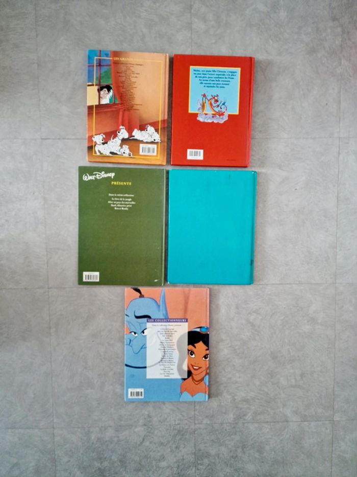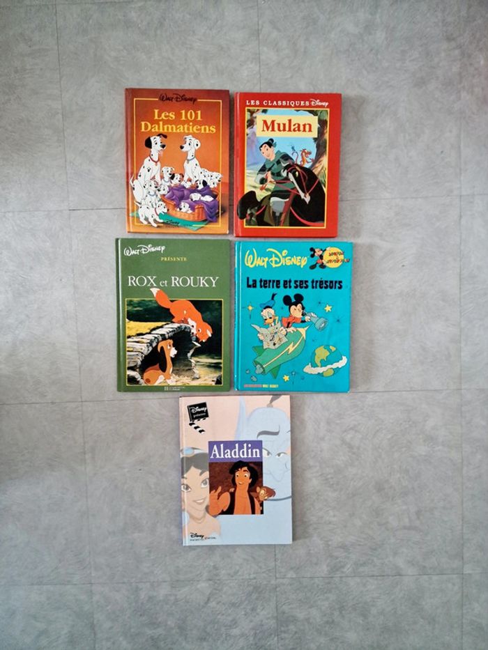 Lot de 5 livres disney : 101 dalmatiens, mulan, rox et rouky, mickey, aladdin Assez ancien, mais en bon état général.