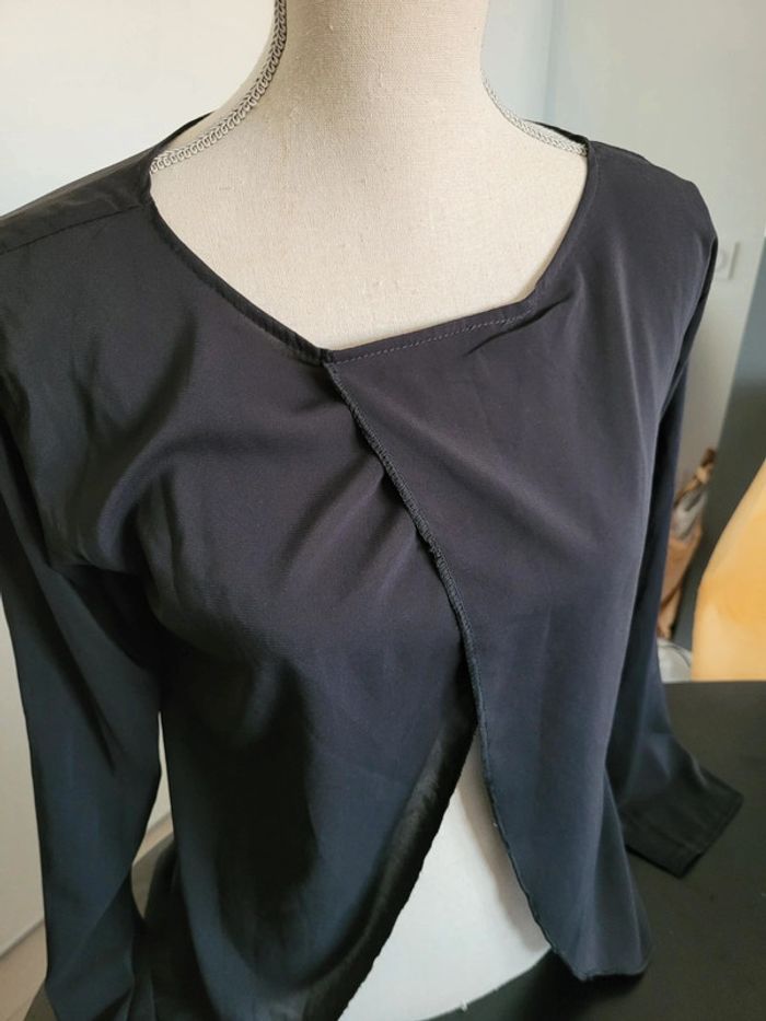 Chemisier asymétrique noir transparent et ouvert sur l'avant, se porte avec un haut en dessous taille 38/40. #jeannegomez_teeshirt_femme
