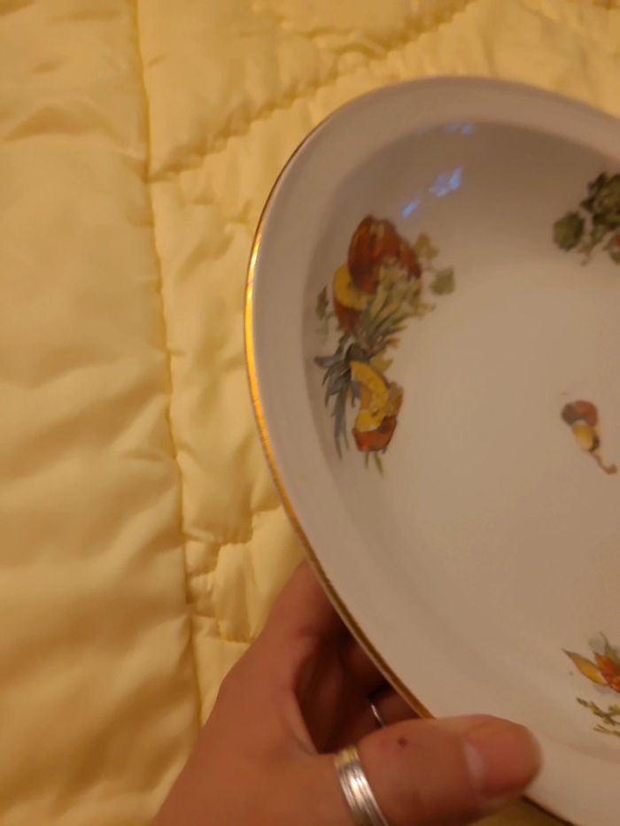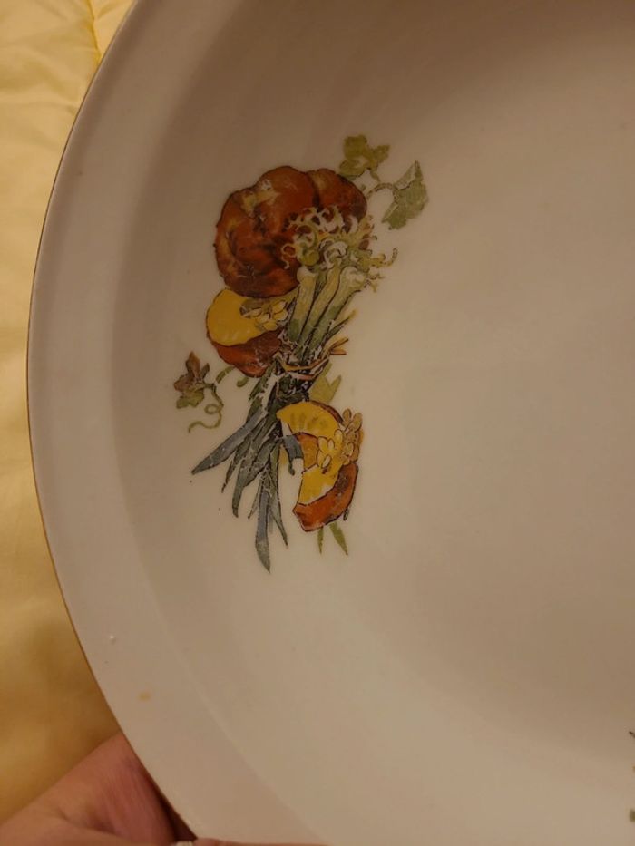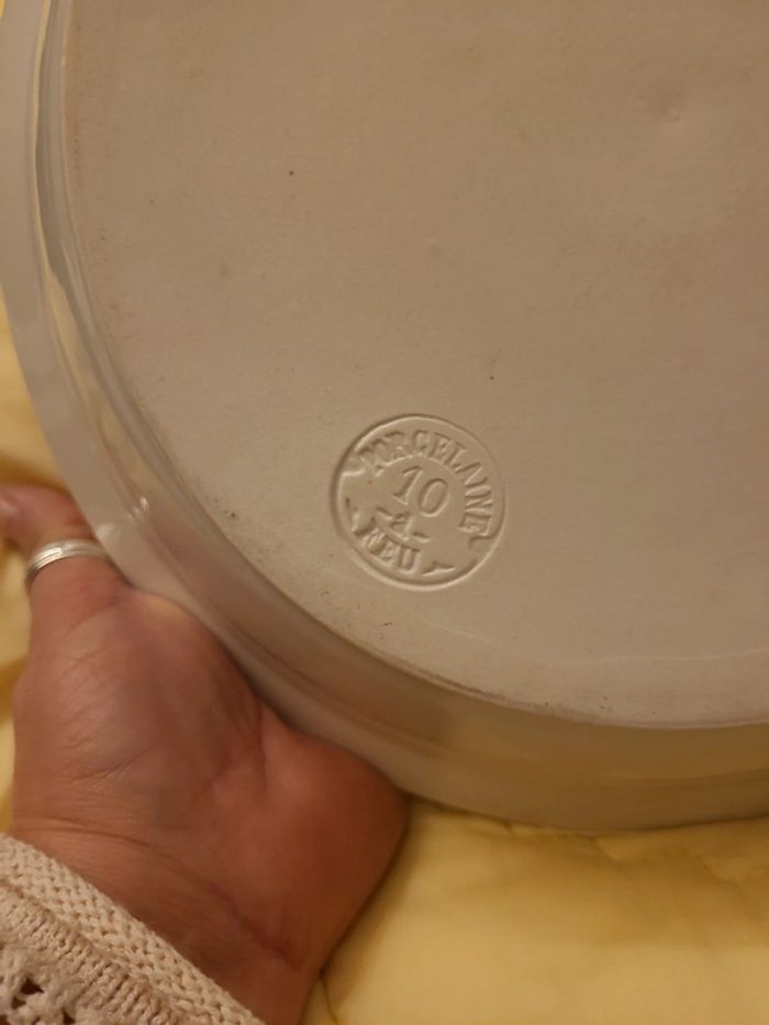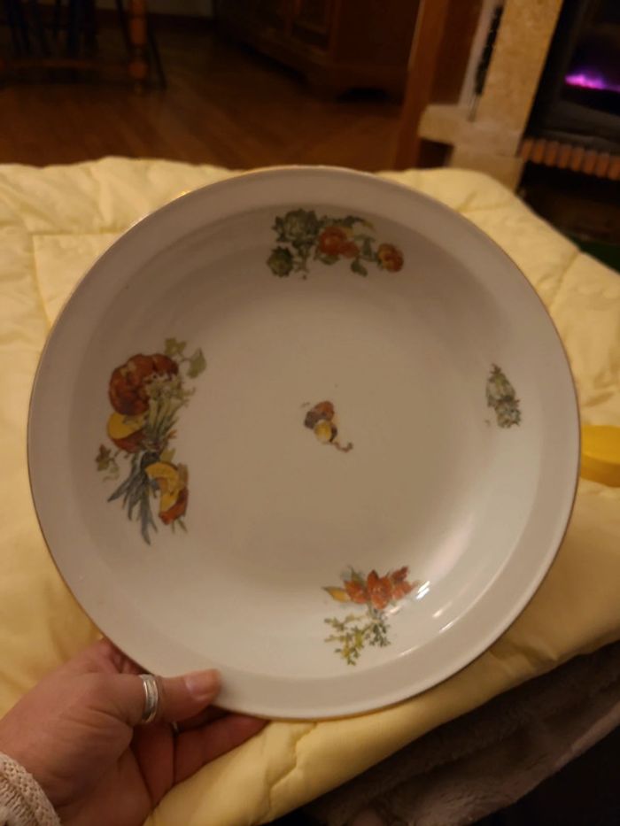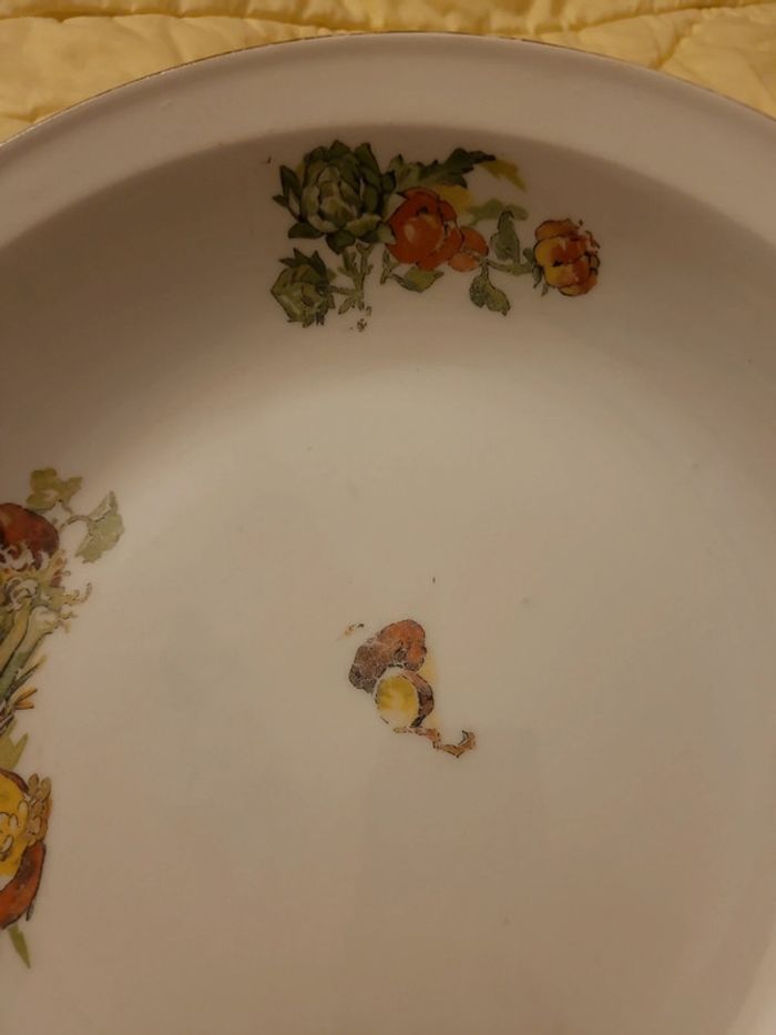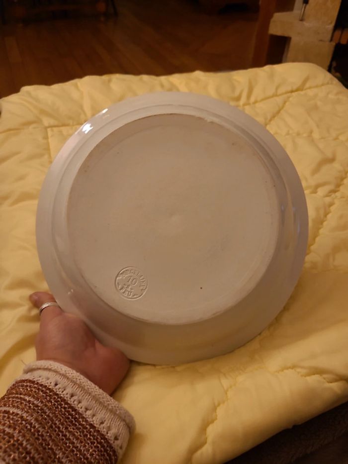 ⬇️mes autres annonces d'article de maison, décoration👉 #cg89déco 😁 réductions activées des 2 articles ! un plat creux de service de 28 cm de diamètre et 6 cm de profondeur, avec des motifs de légumes. Le tour est doré Il n'est pas ébréché, bon état (petite usure du à l'utilisation). Porcelaine à feu #plat #decoration #doré #motif #platdeservice #tableau #porcelaineafeu