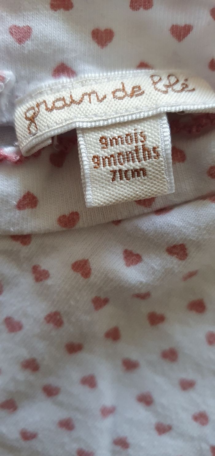 Tee-shirt manches longues pressions dos Bébé 🚼 fille Taille 9 mois Couleur fond blanc cœur rose Marque grain de blé Maison non fumeur
