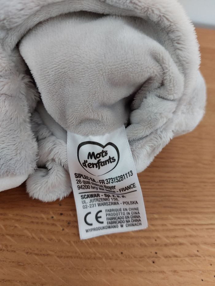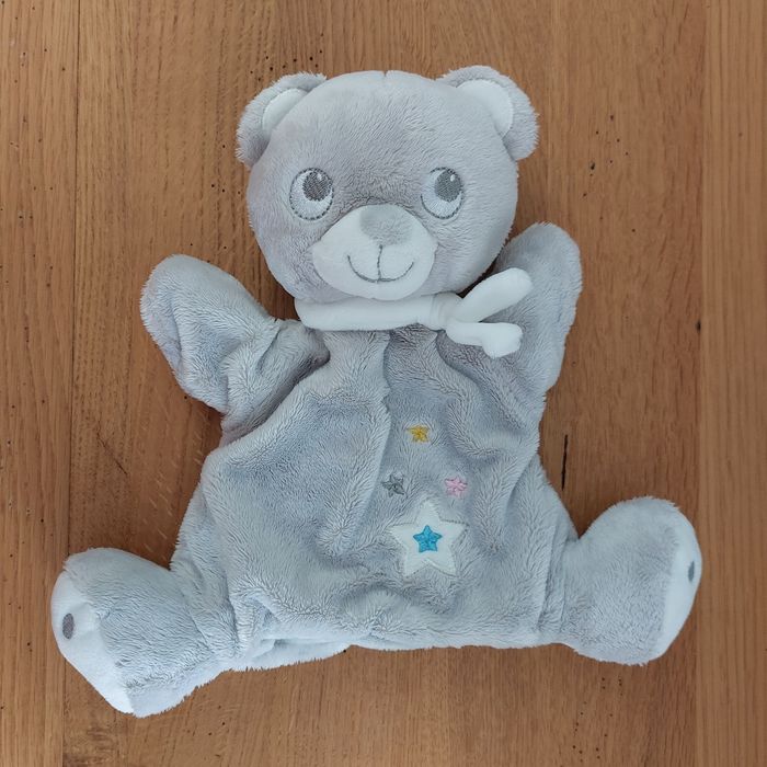 Doudou Ours marionnette Mots d'enfants Très bon état Gris, blanc, étoiles