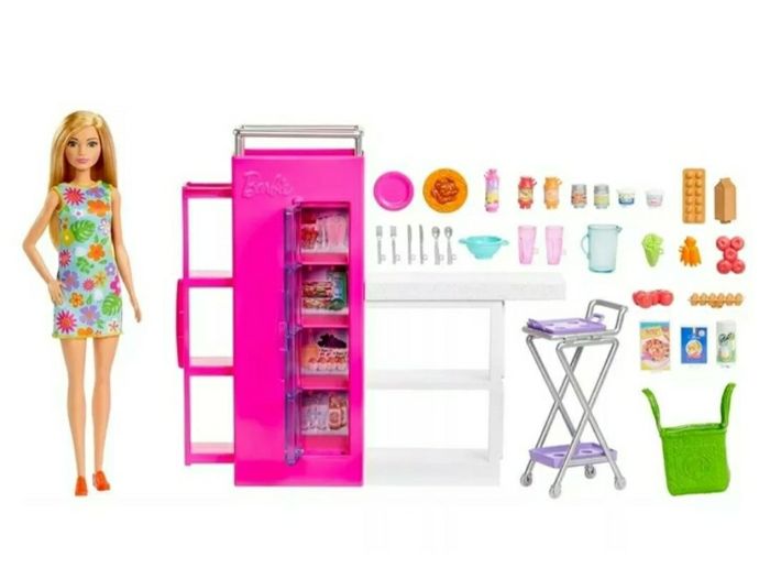 NEUF JAMAIS OUVERT Age conseillé : de 3 à 10 ans Les enfants vont adorer s’amuser avec Barbie et son garde-manger.  Avec tous ses accessoires de cuisine, ce coffret peut s’utiliser seul ou venir compléter une maison de poupée. La poupée Barbie porte une robe à fleurs et un tote bag qu’elle adore emmener au marché ou chez l’épicier. Si la cuisine est le cœur de la maison, le garde-manger en est les fondations. Ouvrez la porte du réfrigérateur pour organiser la nourriture ou dévoilez les étagères cachées du garde-manger. L’îlot central de cuisine est idéal pour préparer le repas et s’installer pour manger. La desserte indépendante permettra de servir tous ces succulents plats. Le coffret garde-manger inclut plus de 30 accessoires de jeu, comme des œufs, des légumes et de la vaisselle, ainsi qu’une adorable feuille de stickers nourriture pour que les enfants s’amusent à personnaliser leur cuisine