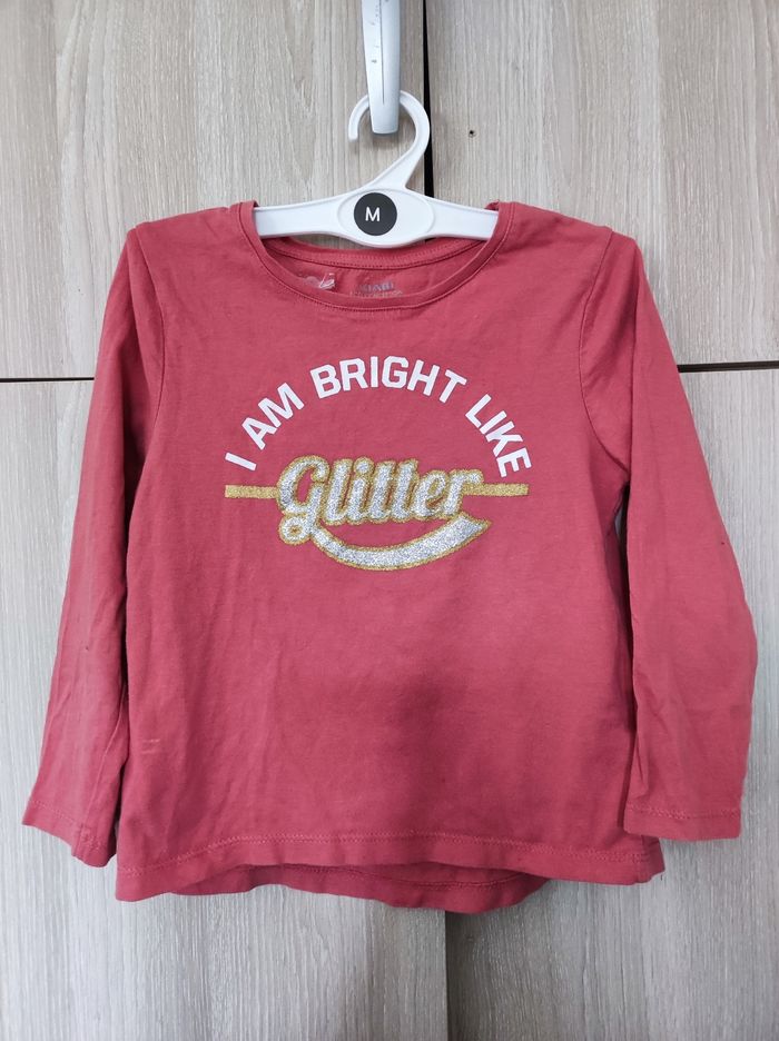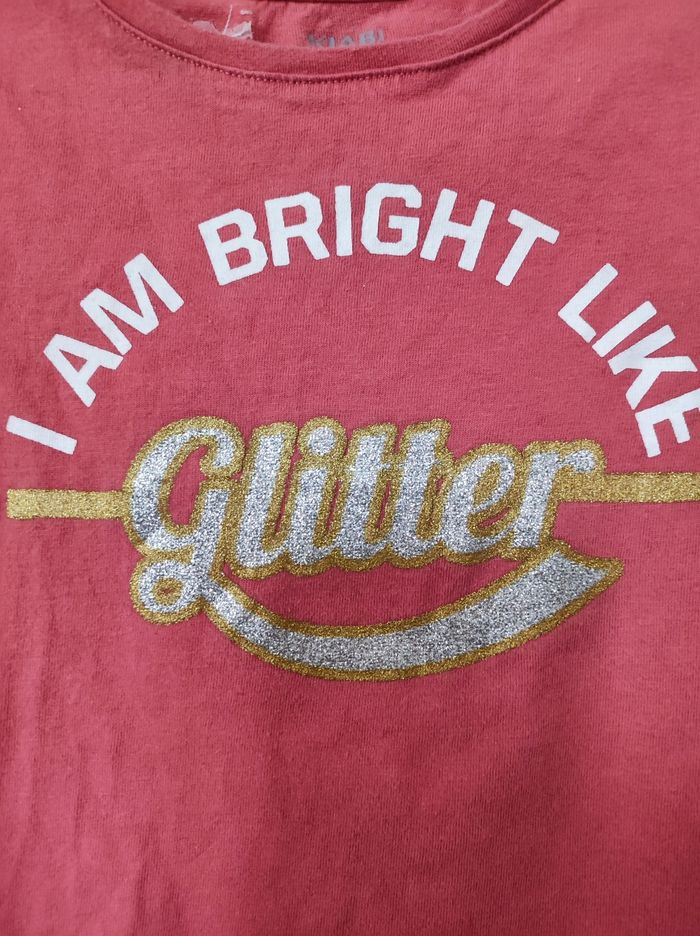T shirt ML / sweat fin Marque Kiabi Taille 4 ans - 98 - 107 cm Col rond. Manches longues. En coton eco conception / coton biologique. Coloris rose orangé avec écriture blanche et paillette argent & doré style rétro/ vintage. ' i am right like glitter' Parfait état