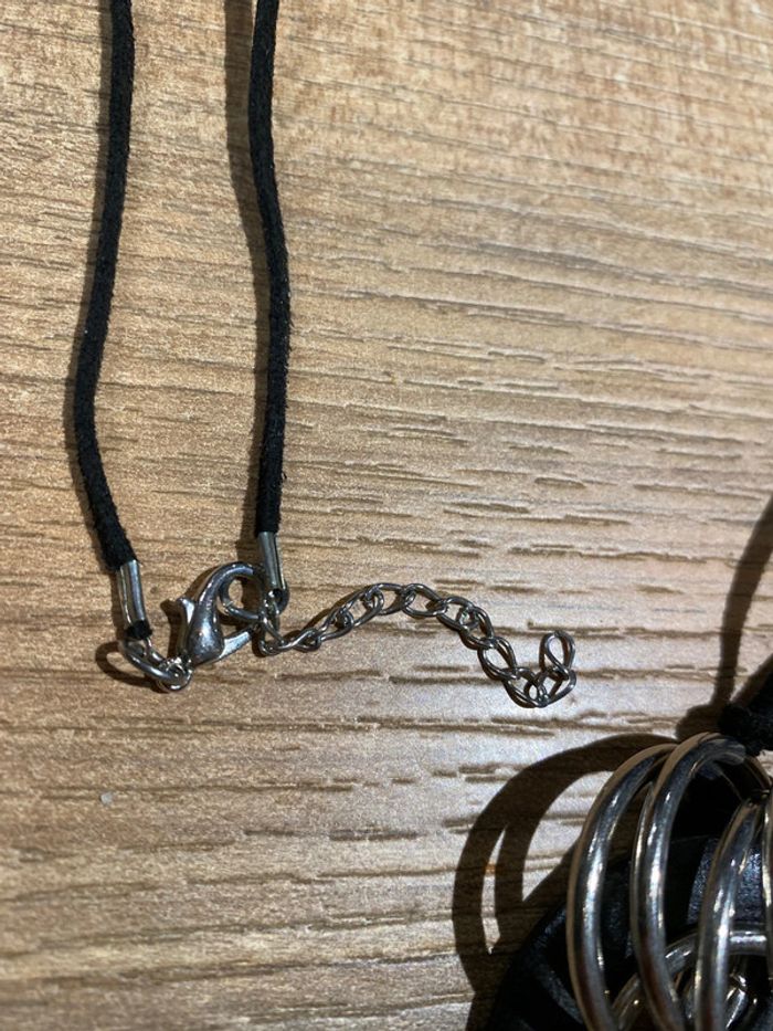 Jolie collier en daim. Avec ronds argentés. Il fait 45 cm environ.