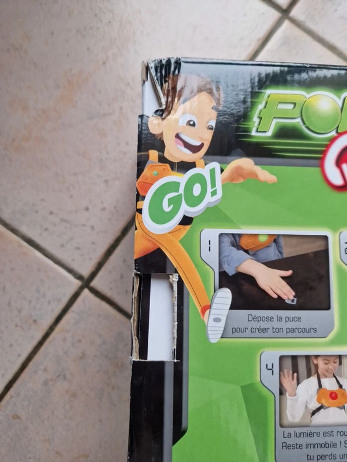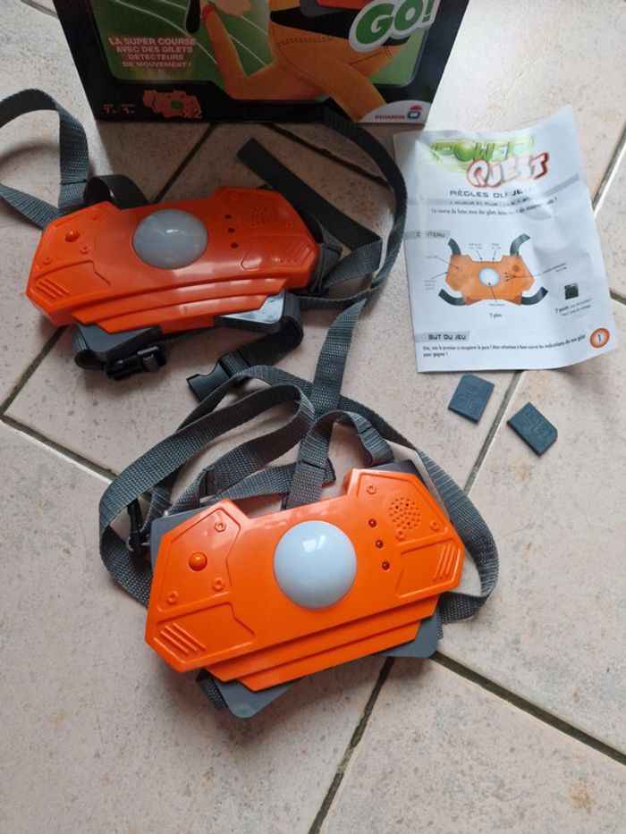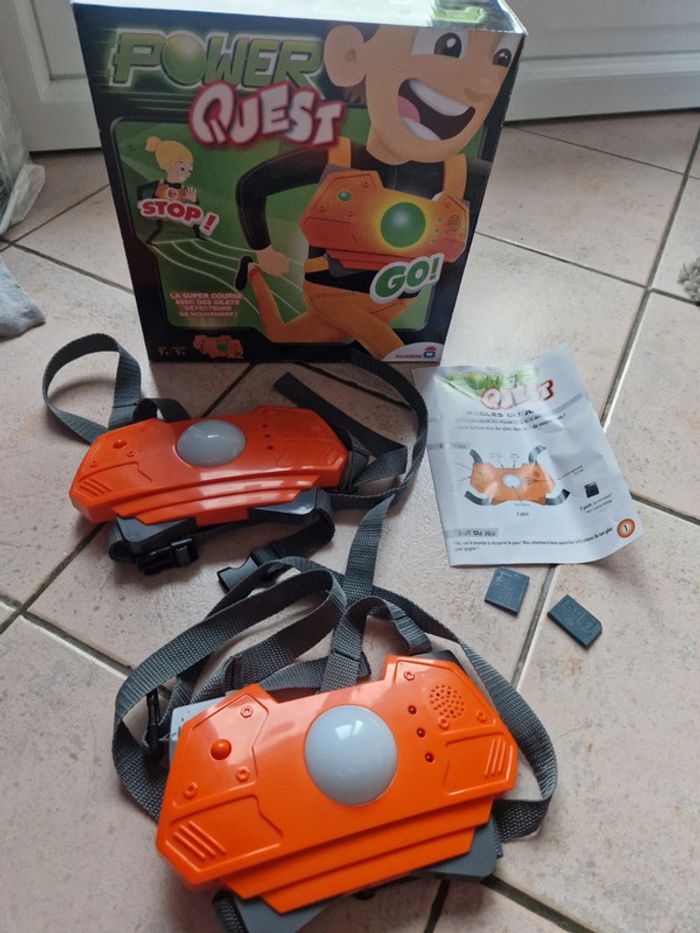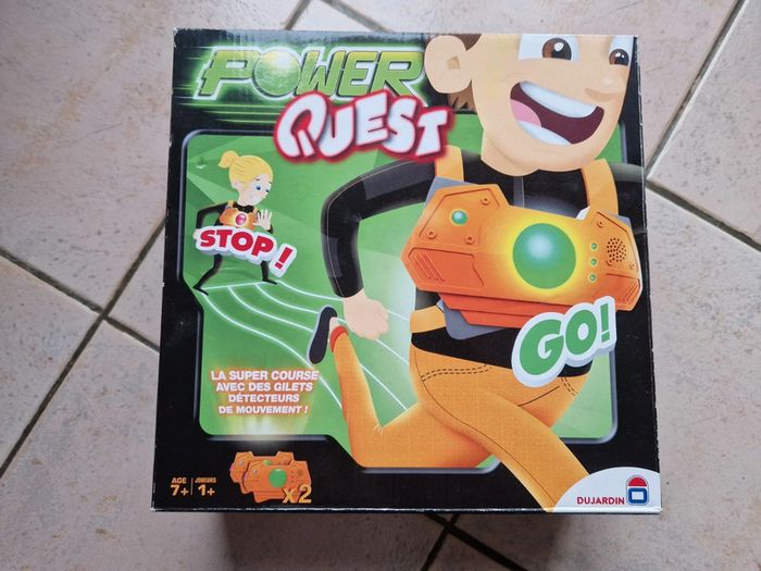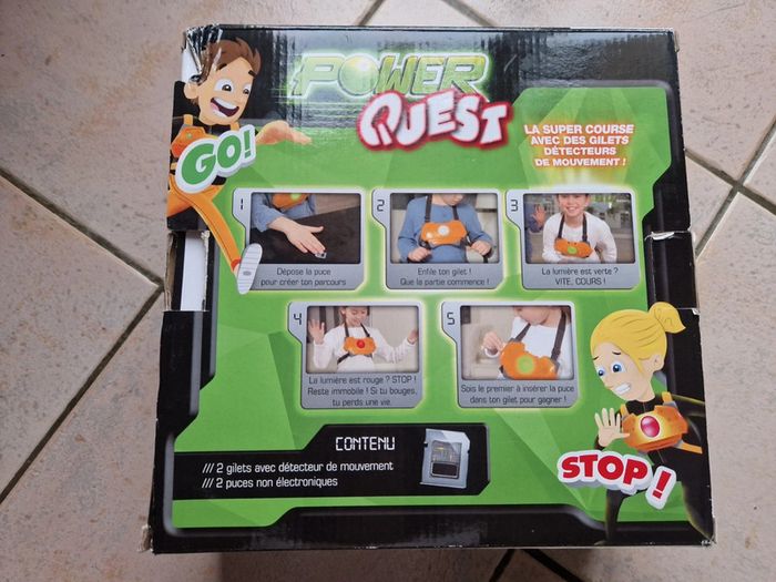 Jeu Power Quest, la boite est légèrement abîmée. Principe du jeu : · Dépose la puce quelque part. · Enfile ton gilet ! · La lumière est verte ? Vite, cours ! · La lumière est rouge ? Stop ! Reste immobile ! Si tu bouges, tu perds une vie. Le gagnant est le premier à insérer la puce dans son gilet. #jouetsgain_de_place