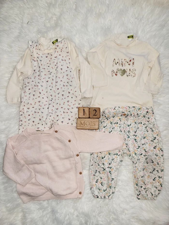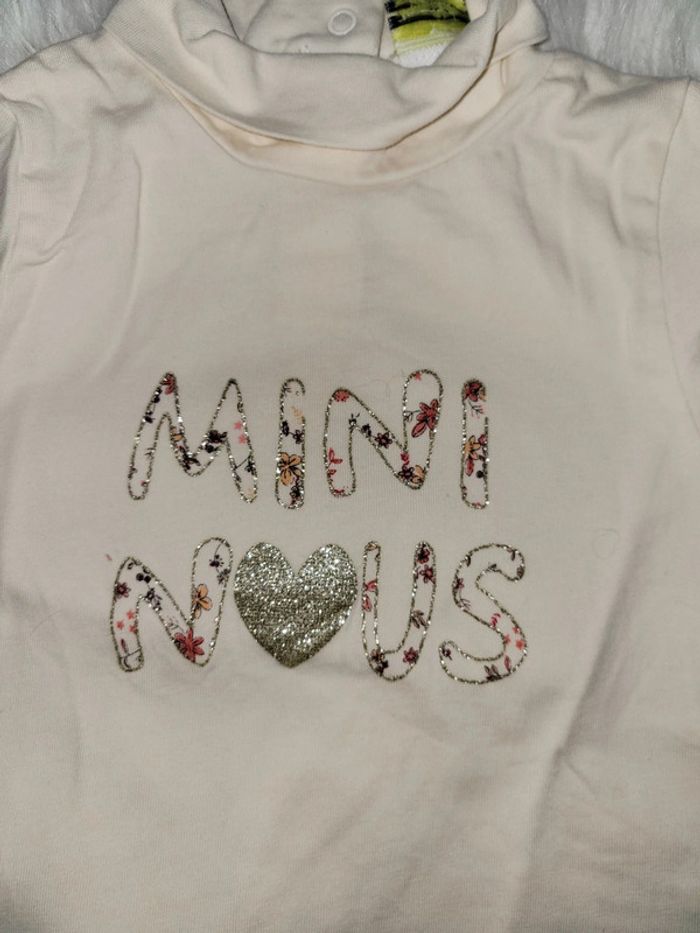 Lot hiver constitué d un tee shirt col roulé mini nous neuf, D un tee shirt col roulé neuf, D une salopette fleurie, D un gilet ouverture côté, Et d un leggin offert