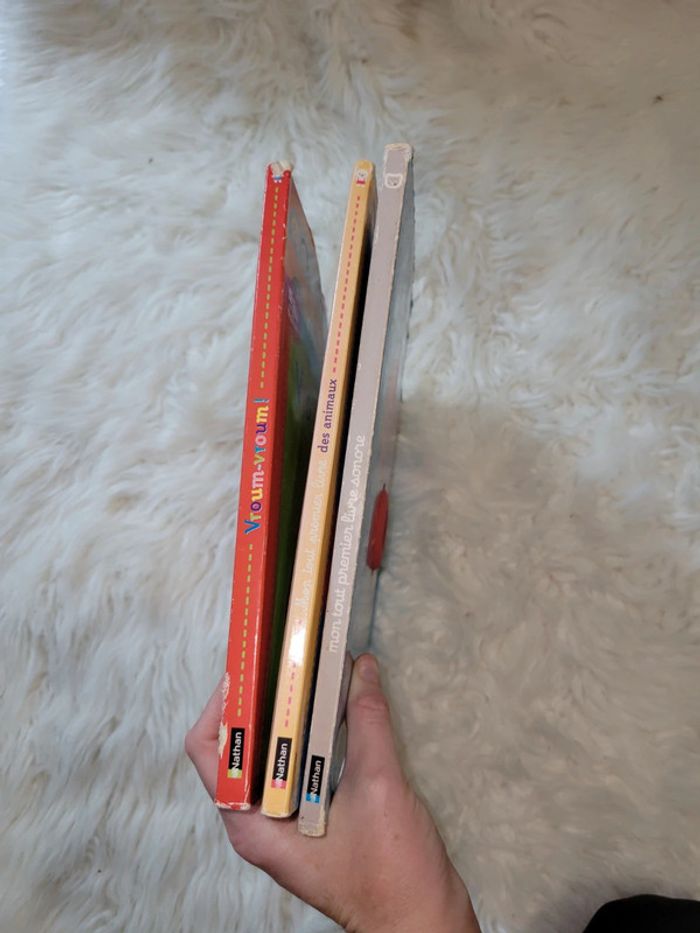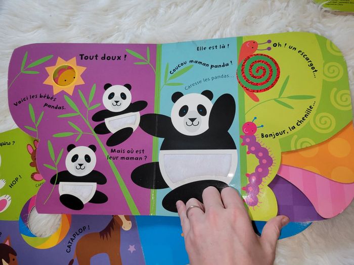 3 livres avec des matières à toucher. Livre des animaux :panda,oie,chat,elephant,zebre. Livre sonore le nez fait quik quik , Livre vroumvroum des vehicules