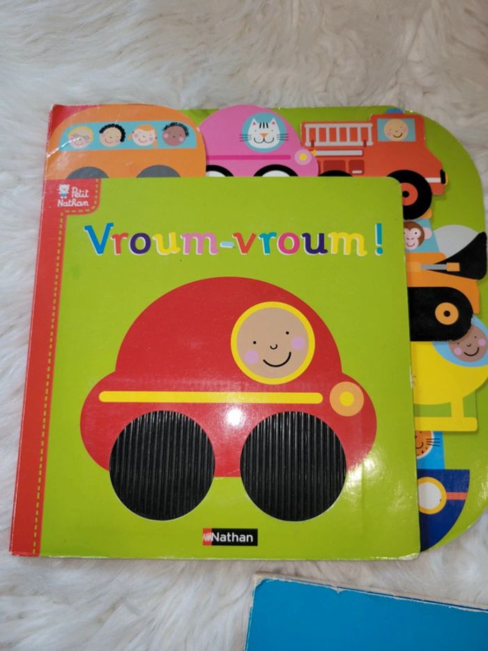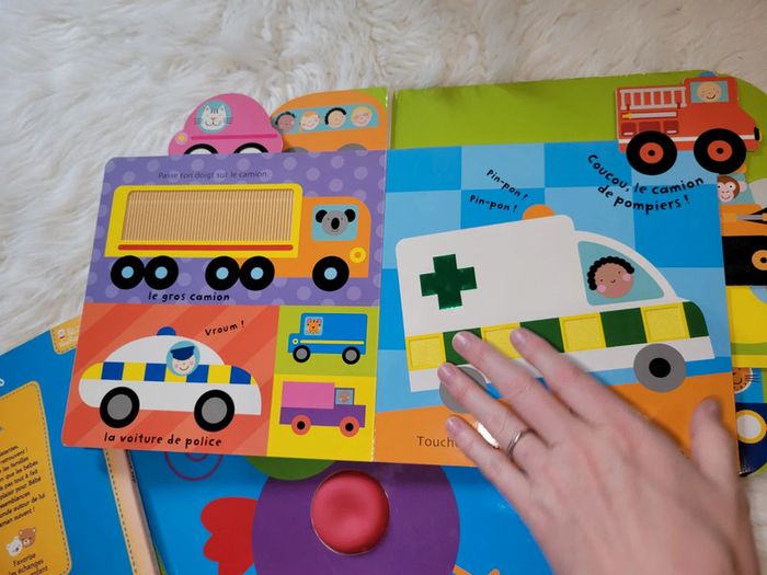 3 livres avec des matières à toucher. Livre des animaux :panda,oie,chat,elephant,zebre. Livre sonore le nez fait quik quik , Livre vroumvroum des vehicules