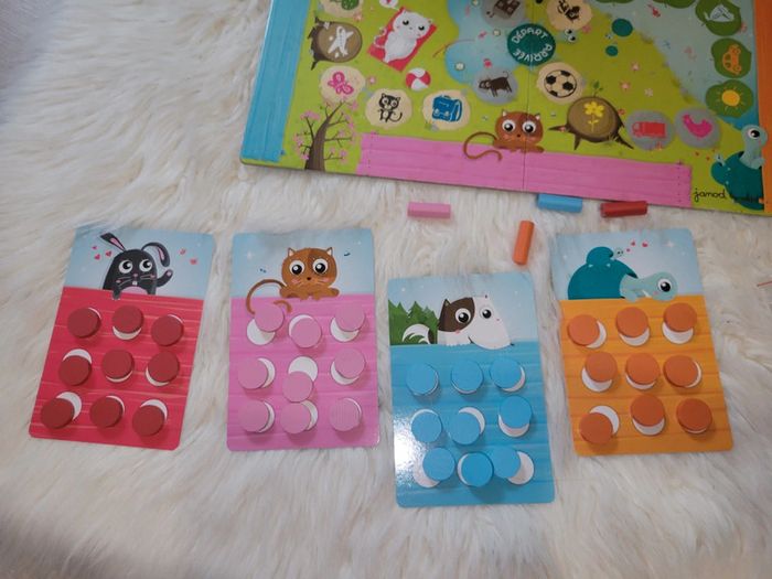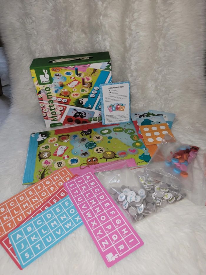 Le joueur qui tombe sur un dessin doit le nommer et tenter d écrire le mot. Lettres majuscules et minuscules. Jeux complet,pion et planches. La boîte a vécu ,jeux tbe Des 4 ans