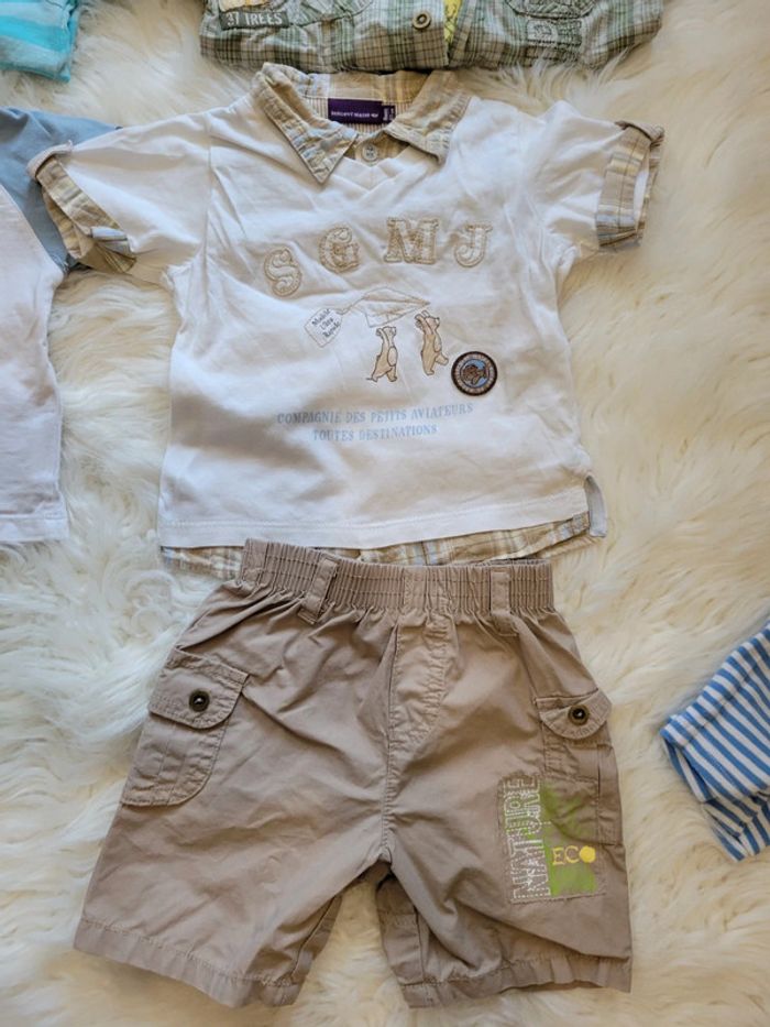 Un ensemble sucre d orge short vert anis et tee shirt tchou tchou, Un ensemble tee shirt effet chemise sergent major un short. Le short beige peu aussi se combiner à la chemise,mais elle a un défaut donc offerte. Un short rayé dpam, Un tee shirt turquoise rayé tuctuc, Un tee shirt orange tissaia Et un tee shirt sucre d orge.
