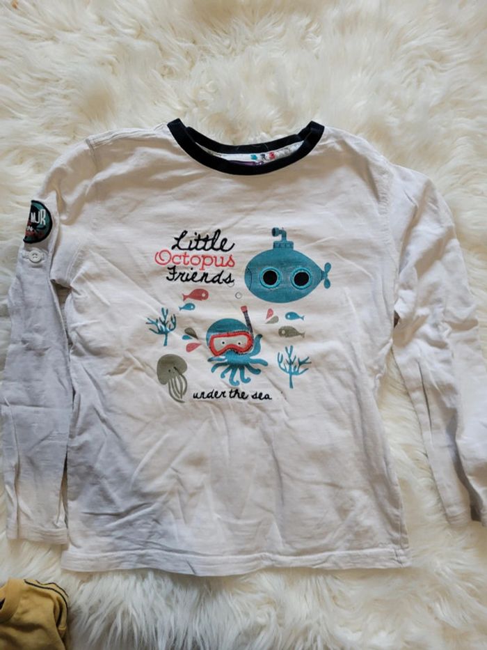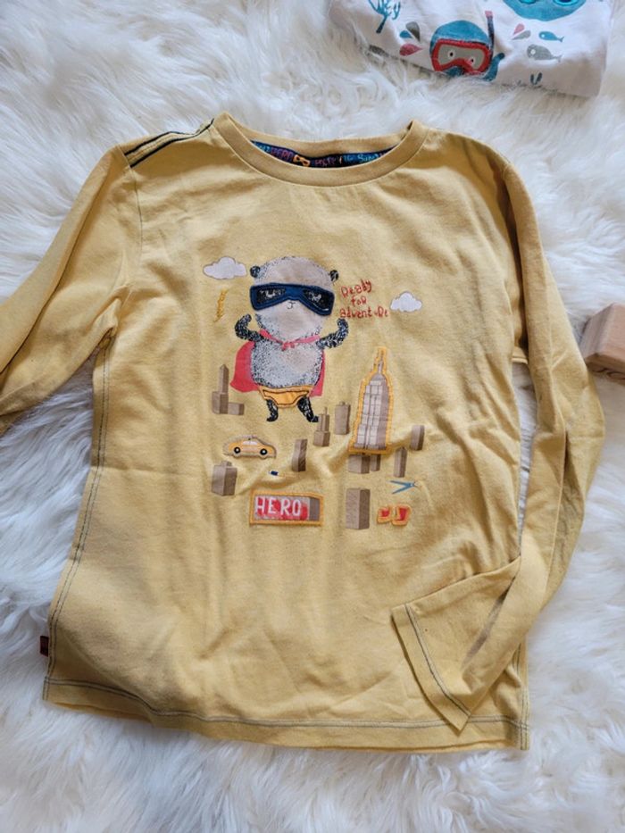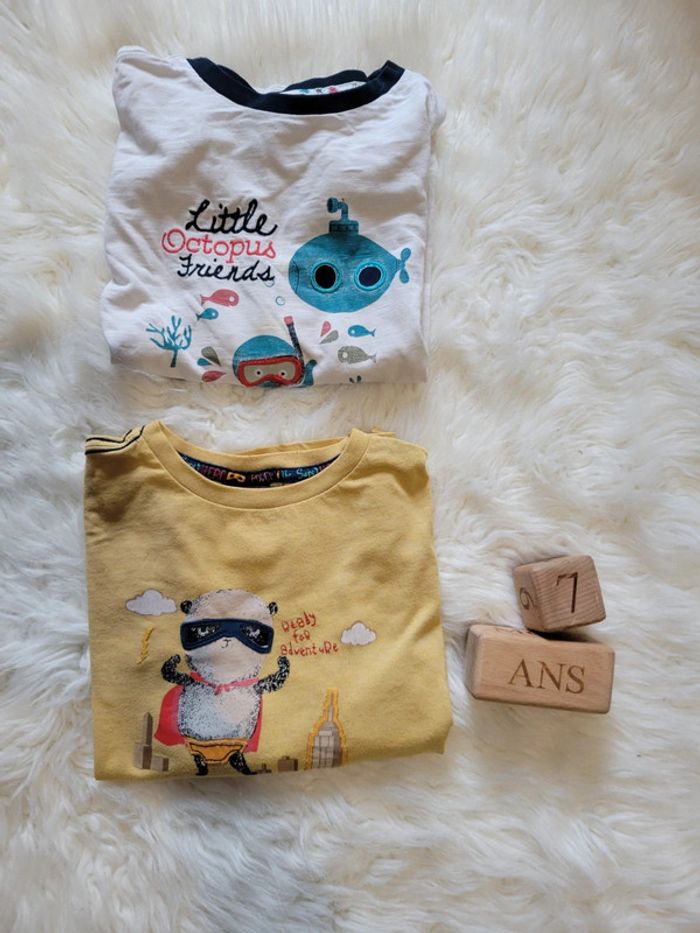 Tee-shirt jaune bien porté imprimé super hero recto verso Tee short blanc octopus offert car défaut aux manches