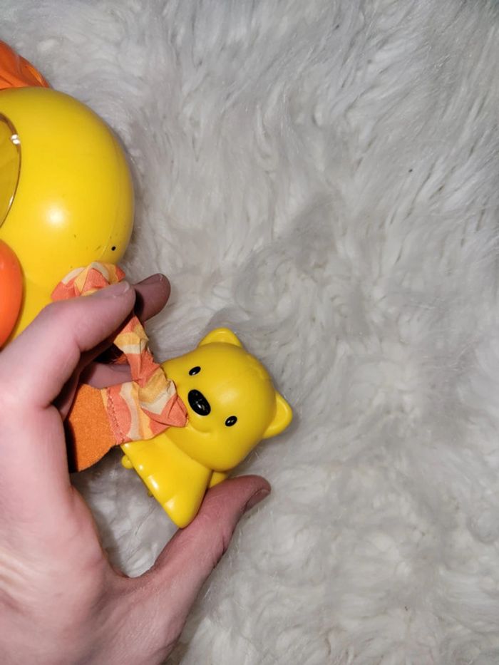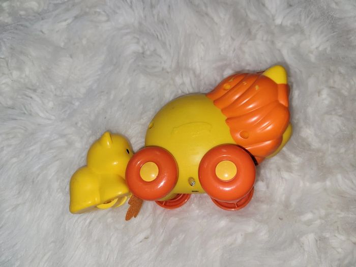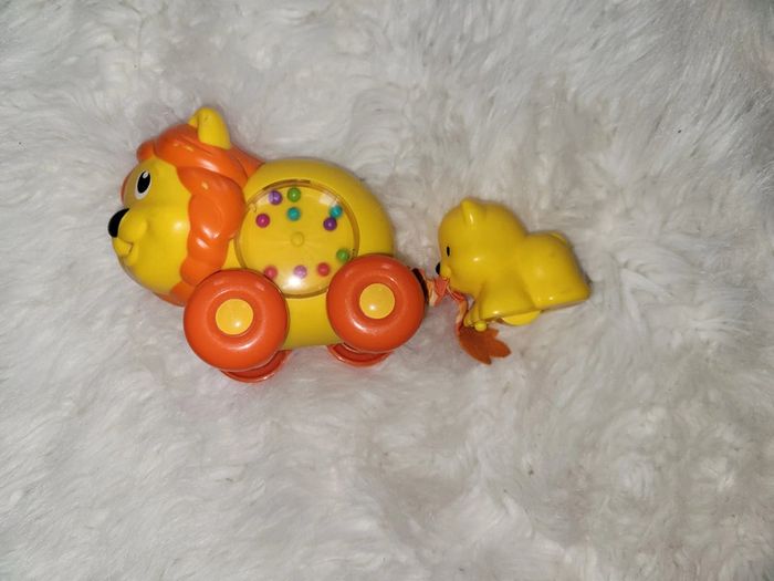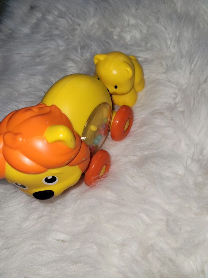 Le lion a le ventre animé de bille et le lionceau tire sur la queue ressort Quand la queue se rétracte la maman roule toute seule. Quelques traces de peinture enlevée