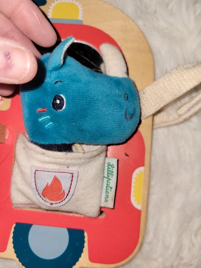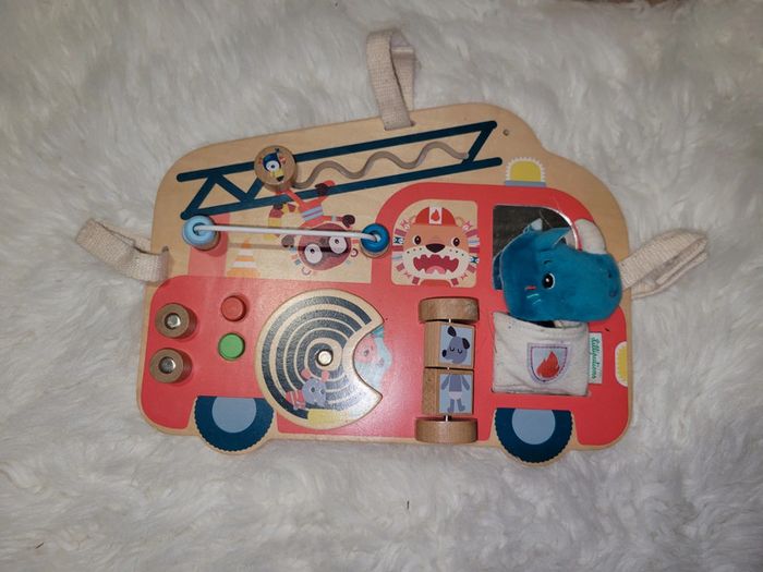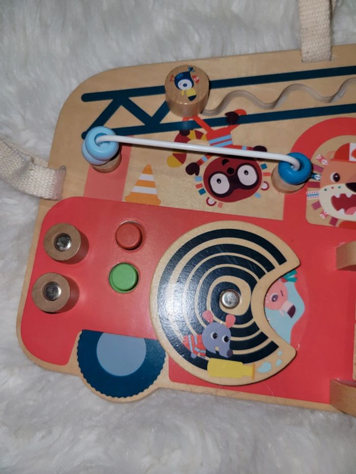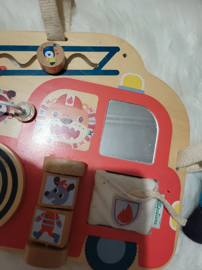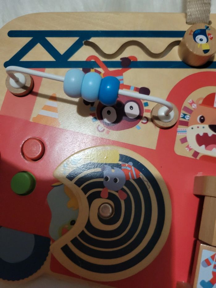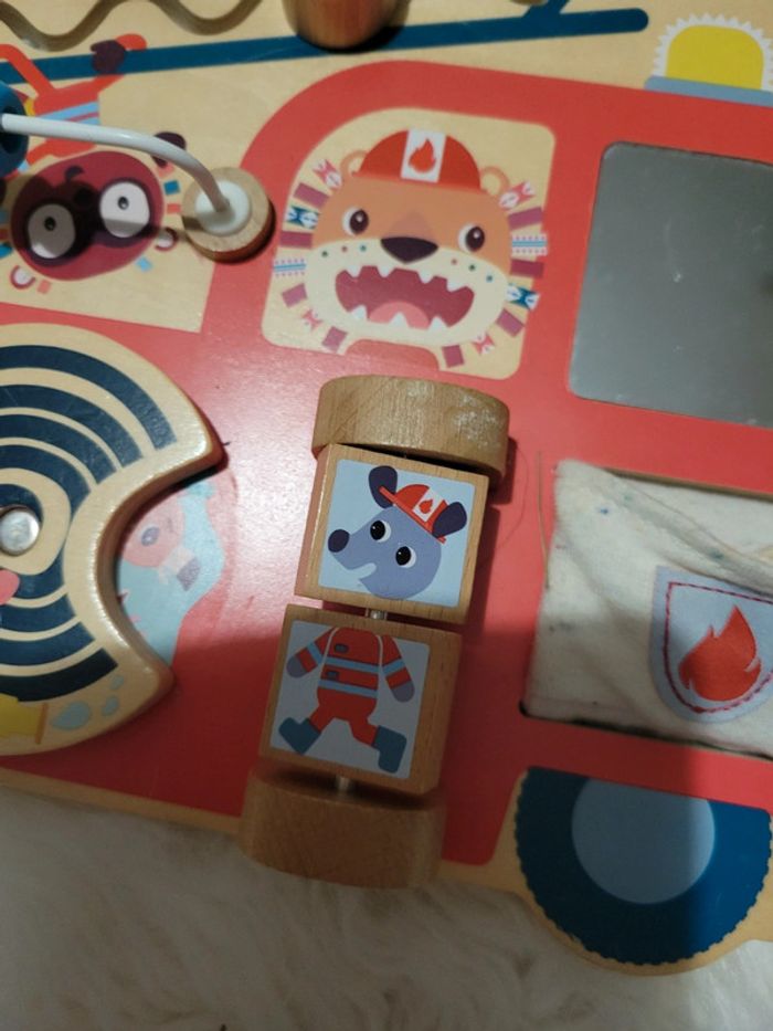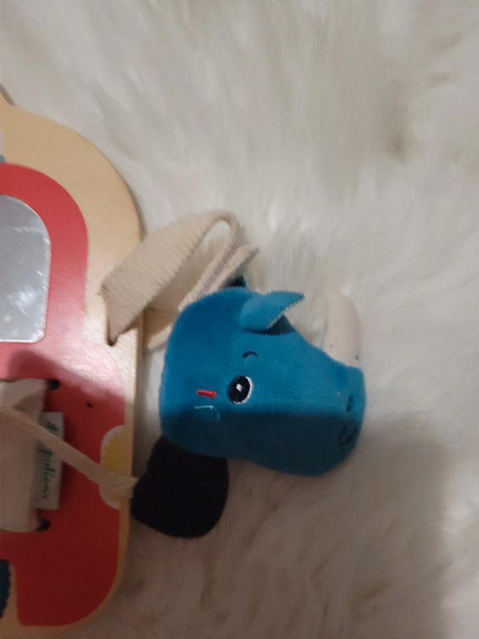 Tableau d activités avec Marius le rhinocéros. Des boutons, des perles ,un miroir,