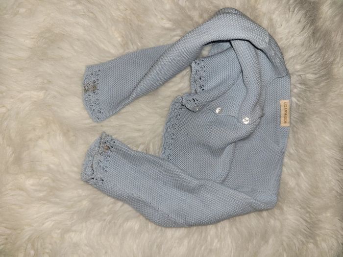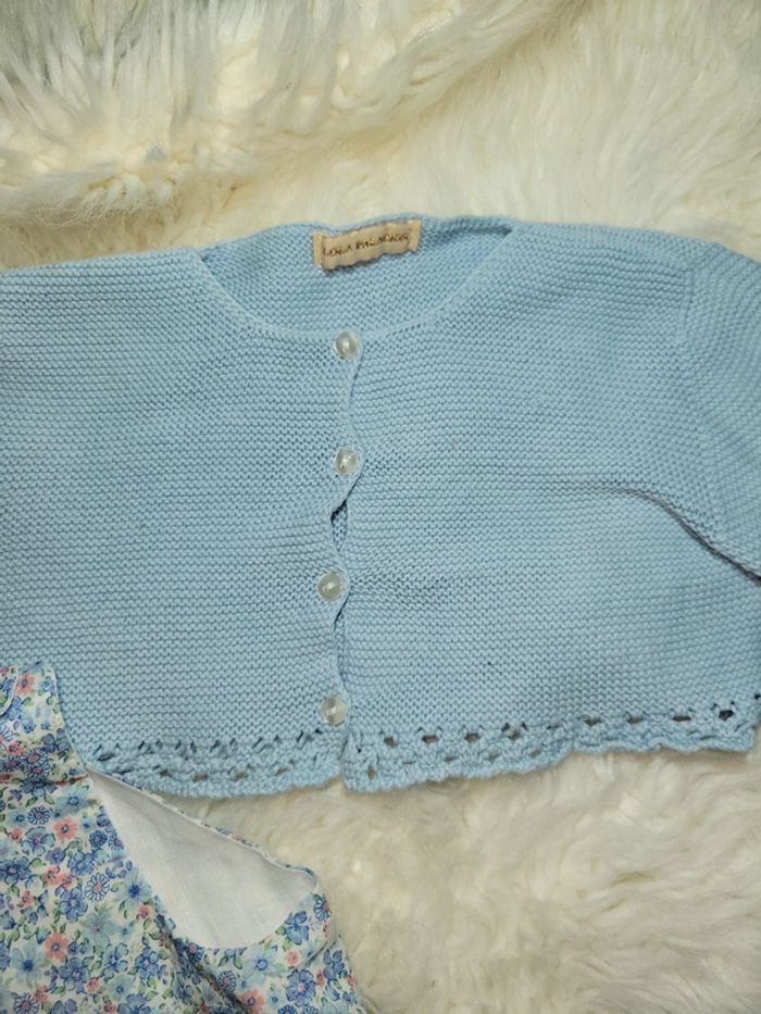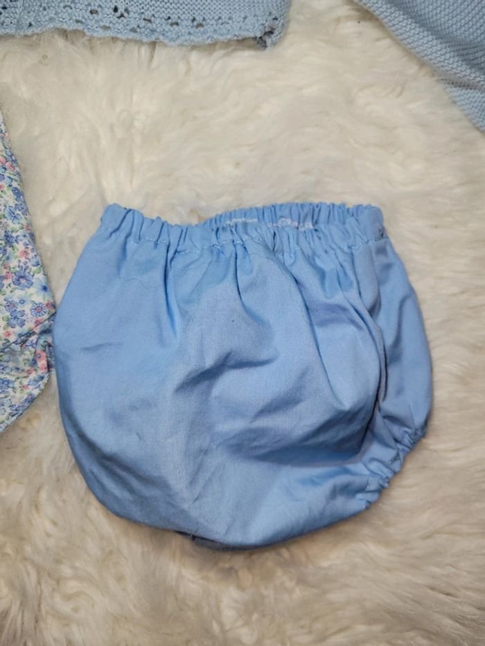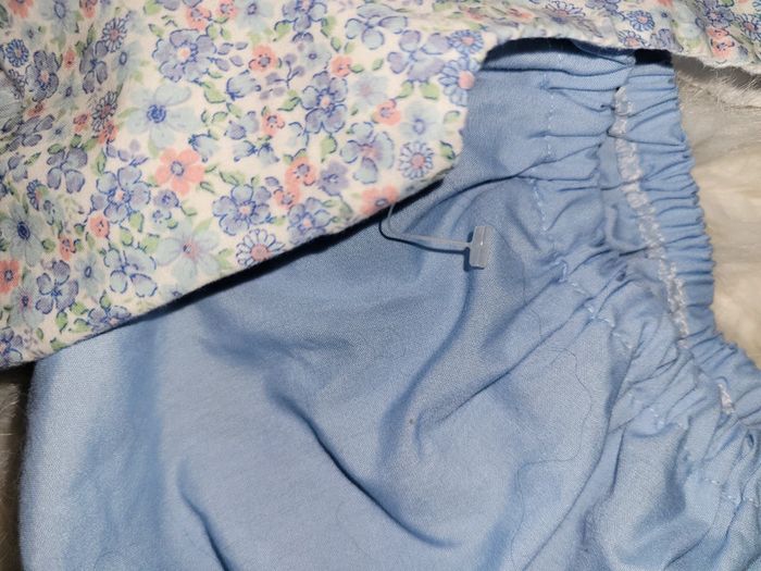 Ensemble été constitué d un haut caché cœur dos encore avec le plastique d étiquette pas porté, d un bloomer. Et d un gilet porté, petites taches bas des manches dernière photo. Première main