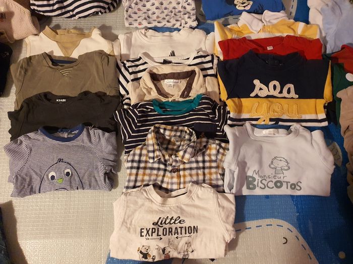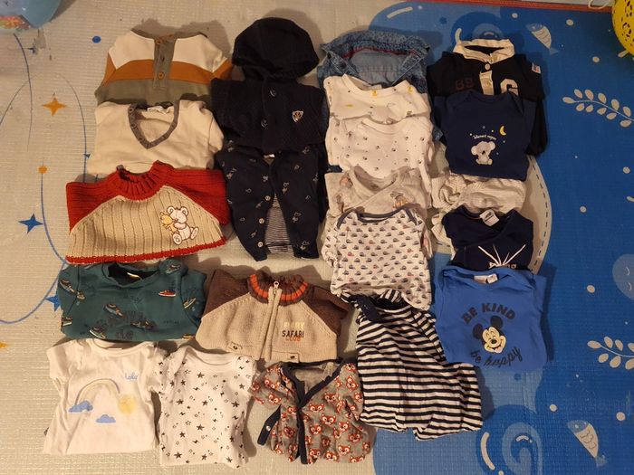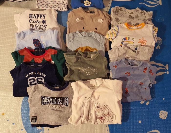 Lot vêtements garçon 3 mois (environ 57 articles). - 14 t-shirts manches longues -9 pantalons - 13 pyjamas - 10 bodies manches longues - 3 bodies manches courtes - 4 pulls -3 vestes - 1 salopette 57 articles à 0.85€ pièce! pour plus de précisions n'hésitez pas à me demander :)