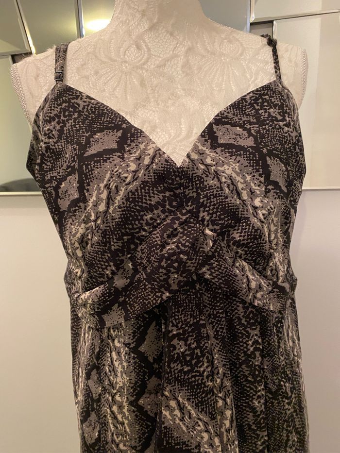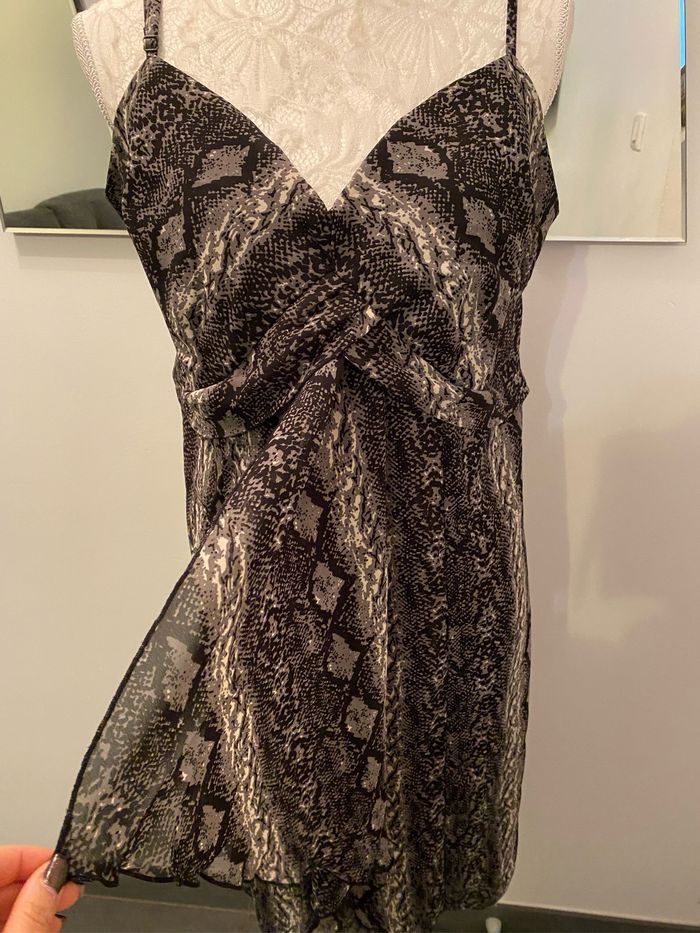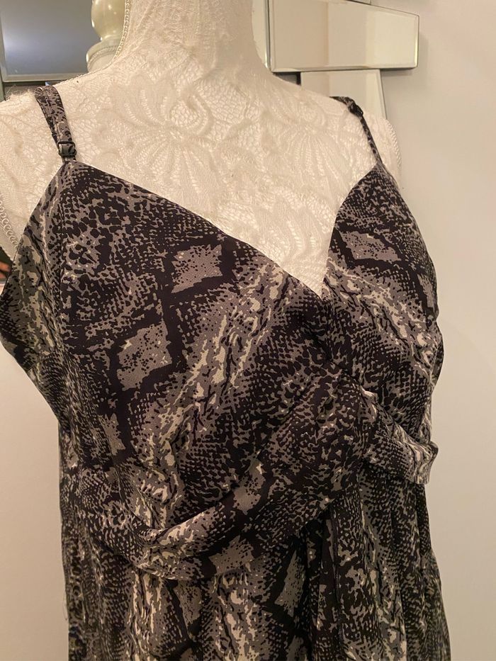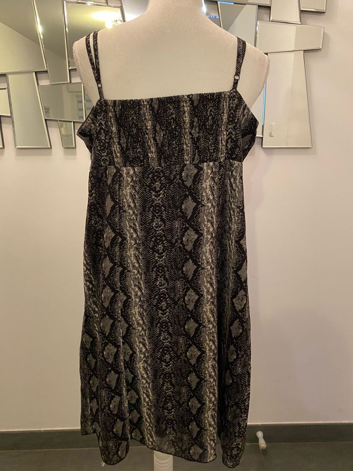 La robe se distingue par un empiècement à volants sur le devant, créant un effet de cascade qui apporte du volume et du dynamisme à la silhouette. 📐Taille 48 📏Dimension : aisselle a aisselle 54 cm Hauteur 94 cm 🏷️Marque : Phildar 🧼 Très bon état : Porté 1 fois 🎨 Couleurs : noir et gris 🎨 Imprimé : motif animalier peau de serpent 🔒 Fermeture sur le côté, bretelle réglables, Non transparente, Élastique au dos