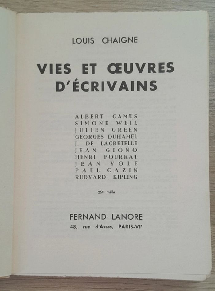 Camus, Simone weil, Julien Green, duhamel, de lacretelle, giono, pourrat, Kipling... Massicote 248 pages 19x14cm