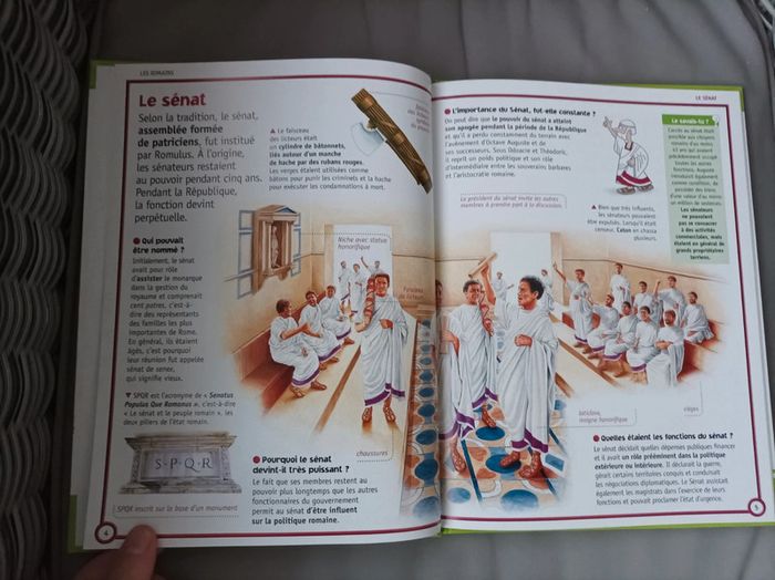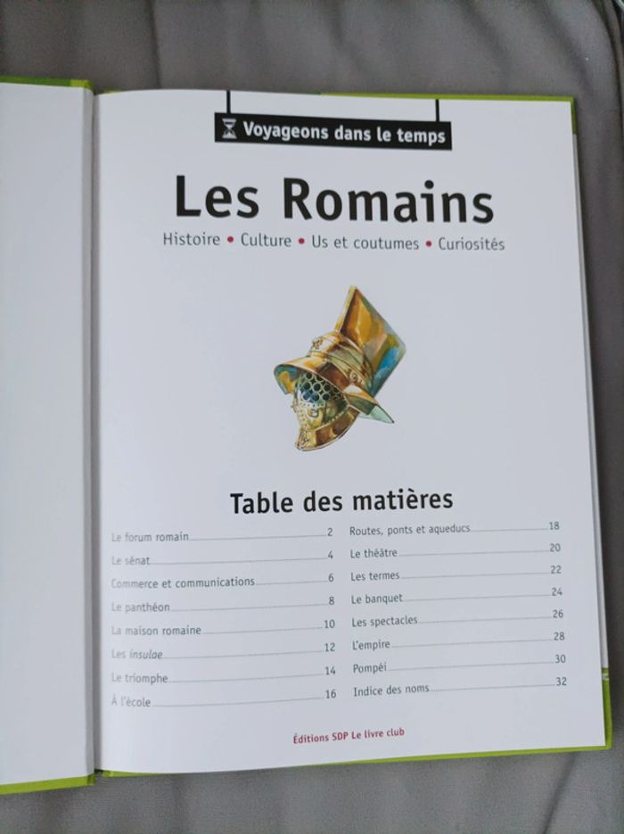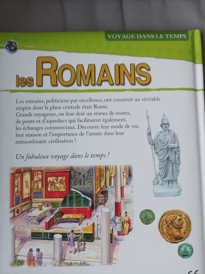 Vends ce livre. État neuf. Jamais utilisé. Les Romains, politiciens pas excellence, ont construit un véritable empire dont la place centrale était Rome. Grands voyageurs, on leur doit un réseau de routes, de ponts, d'aqueducs qui facilitaient également les échanges commerciaux. Découvre leur mode de vie, leur maison et l'importance de l'armée dans leur extraordinaire civilisation ! DIMENSIONS : 22,0 cm × 28,5 cm × 1,0 cm NB DE PAGES : 32 pages #titiya76livre
