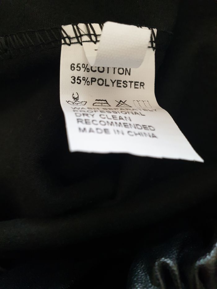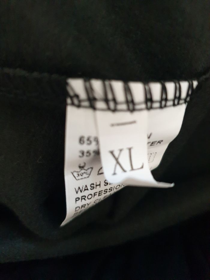 Pantalon noir en simili cuir, pour femme, en très bon état. Large ceinture élastique – Pas d’ouverture. Taille XL 65 % coton – 35 % polyester Les mesures, prises à plat, sont données à titre indicatif et peuvent varier de quelques millimètres. - Longueur totale : 112 cm - Entrejambe : 80 cm - Largeur taille : 33 cm - Largeur bas de jambe : 15 cm - Poids : 378 g Envoi rapide et soigné.