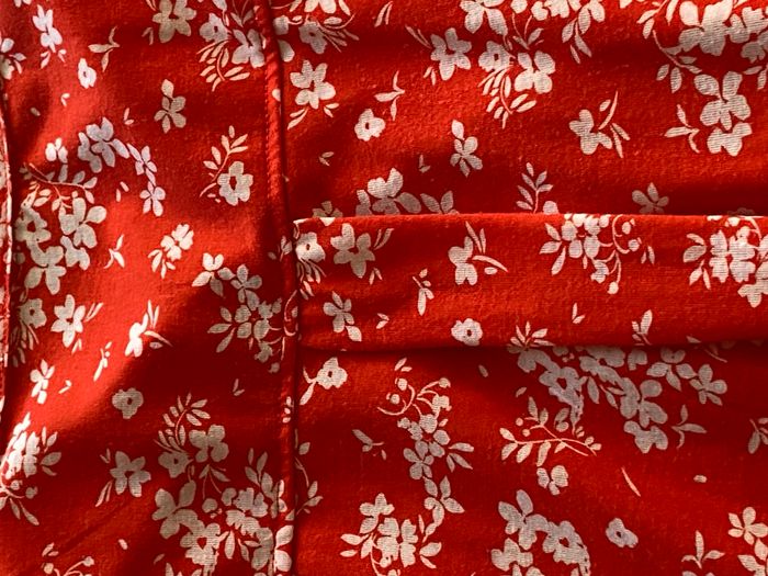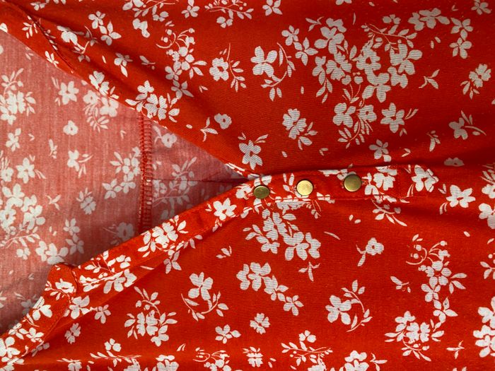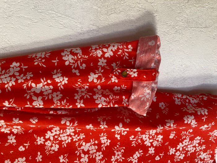 Chemisier rouge à fleurs taille L Possibilité de réduire les manches. Pli d'aisance au dos Hauteur 67 cm - entre aisselles 56 cm Matière 100 polyester
